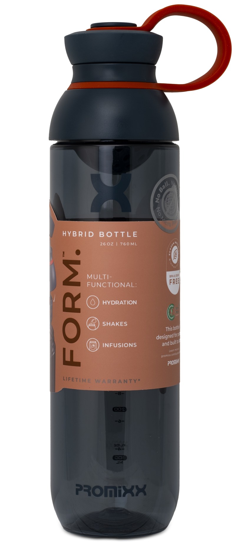 PROMiXX Form Hybrid Bottle er en smart og praktisk flaske i ECOZEN™, et biobaseret og holdbart materiale, som holder smagen ren. Den er lugt- og smagsresistent og let at rengøre. Flasken rummer 760 ml og har et smart låg med integreret bæreløkke, som ligger godt i hånden. Takket være det afrundede snap-fit-agitatorsystem blander du dit pulver både hurtigt og jævnt. Form Hybrid Bottle er helt tæt og passer perfekt til proteinshakes, vand, smoothies og EAA. Flasken er helt fri for hormonforstyrrende stoffer (BPA, BPS og DEHP). En smart flaske til alle dine drikke!