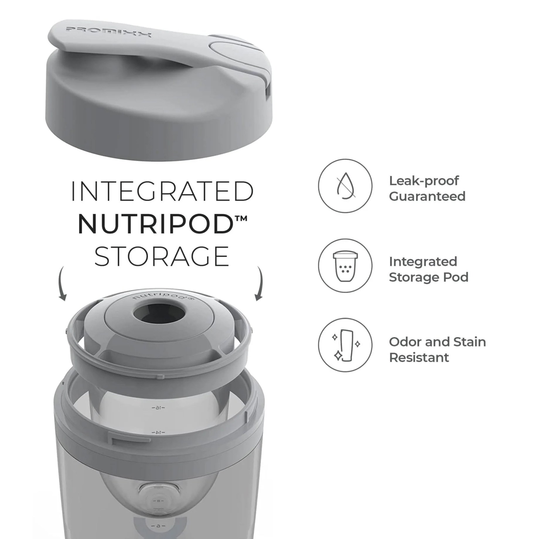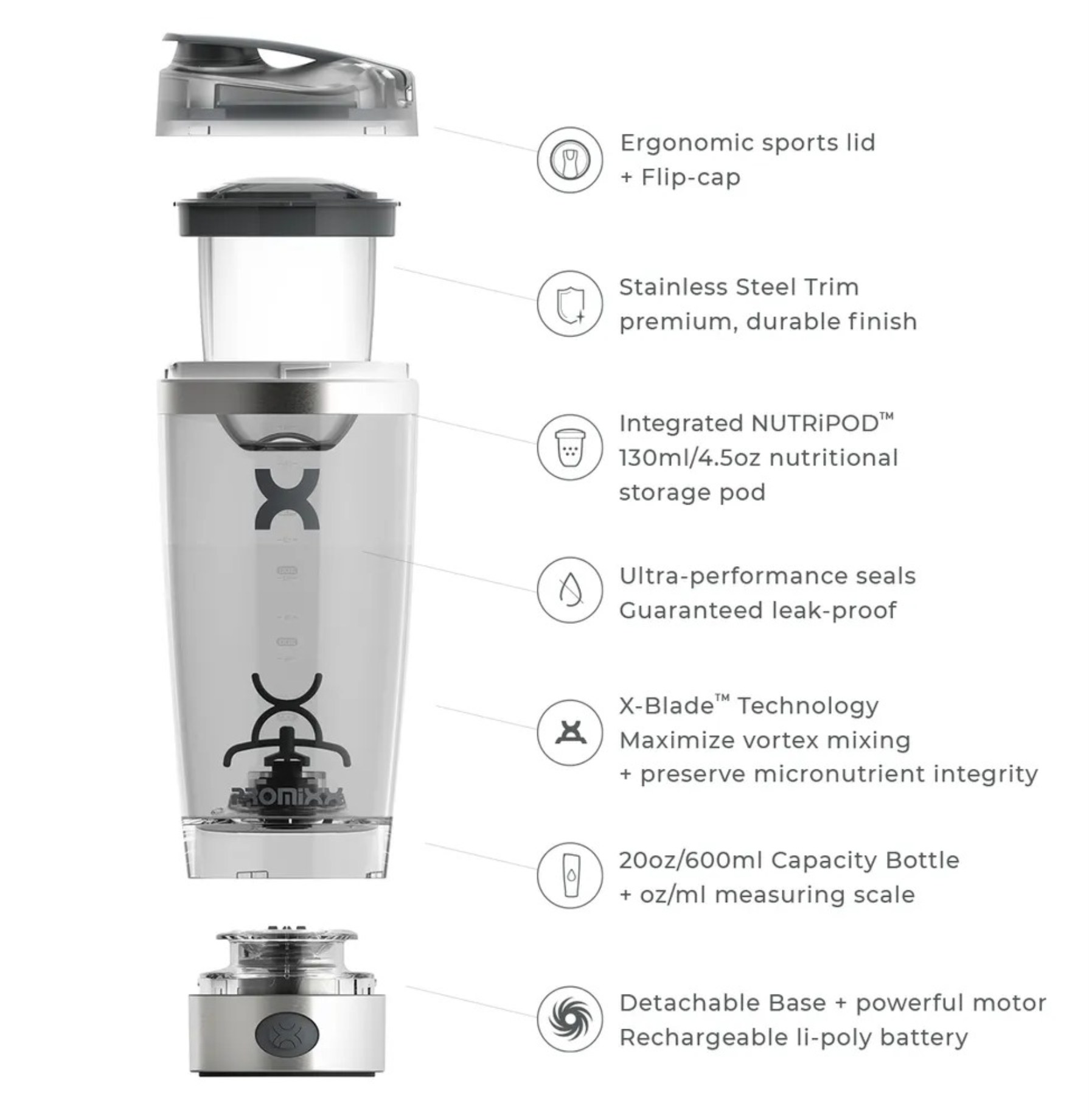 Promixx Pro Electric Shaker er en kraftfuld og smart shaker, der blander dine drikke jævnt og uden klumper - med et enkelt tryk på en knap. Uanset om du bruger protein, restitutionsdrikke eller et andet pulver, giver Vortex Mixing Technology en perfekt konsistens hver gang. Flasken er holdbar, lugtfri og fuldstændigt lækagesikker. Den har et ergonomisk sportlåg samt en indbygget Nutripod-beholder, der er perfekt til opbevaring af pulver, indtil det er tid til at blande. Motoren oplades med USB-C og kan klare op til 90 blandinger pr. opladning.