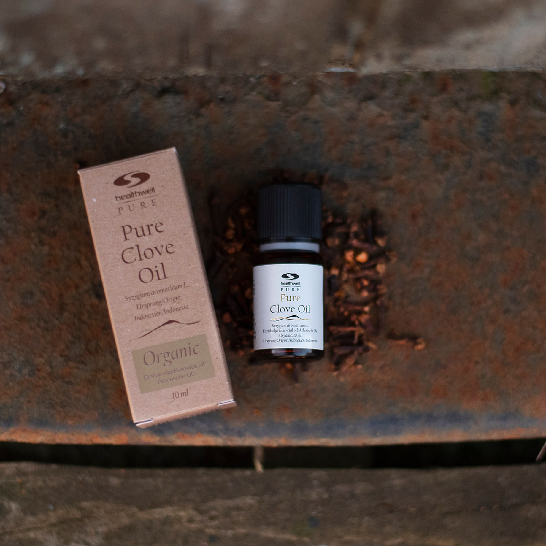 En flaske Healthwell PURE Kryddernellike ØKO ligger sammen med tørrede kryddernelliker.