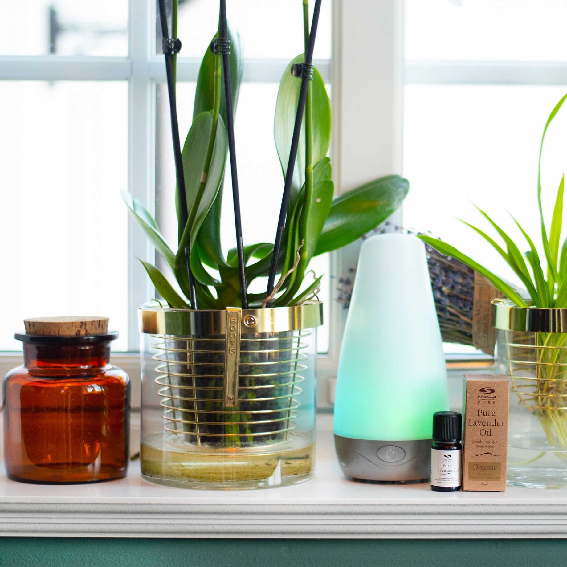 pure lavender oil, øjenpude og æteriske olier i stedet for aromalampe