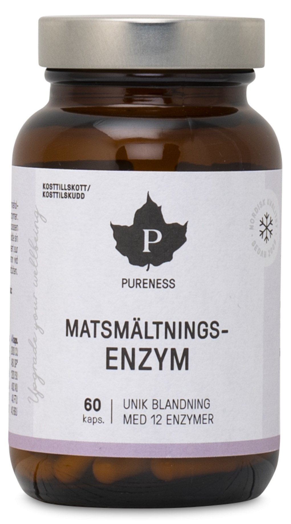 Pureness Fordøjelsesenzym er et kosttilskud med nøje udvalgte enzymer til fordøjelsen. Fordøjelsesenzymer hjælper med at nedbryde protein, fedt og kulhydrater i kroppen og omdanne maden til næring. Der findes flere forskellige typer fordøjelsesenzymer, og Pureness Fordøjelsesenzym er tilsat en række nøje udvalgte enzymstammer. Kosttilskuddet er også udviklet ved hjælp af en særlig teknik, der sikrer, at enzymerne bevarer deres funktion i både et stærkt surt og et stærkt basisk miljø. Dosering er 1 kapsel før et måltid, og effekten er allerede mærkbar efter første brug.