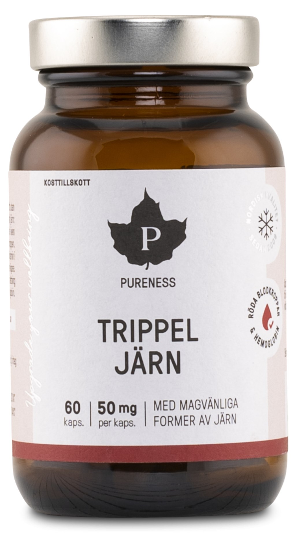 Pureness Trippel Jern er et kraftfuldt jerntilskud, der kombinerer to højtkvalitetsformer af jern: jernbisglycinat og jerngluconat. Den tredje komponent, laktoferrin, er et naturligt forekommende glykoprotein i kroppen, der indeholder betydelige mængder jern og også spiller en rolle i transporten af jern i kroppen. For yderligere at forbedre optagelsen indeholder tilskuddet også C-vitamin. Jern er afgørende for normal energiomsætning og immunforsvarets funktion, reducerer træthed og støtter dannelsen af røde blodlegemer.
