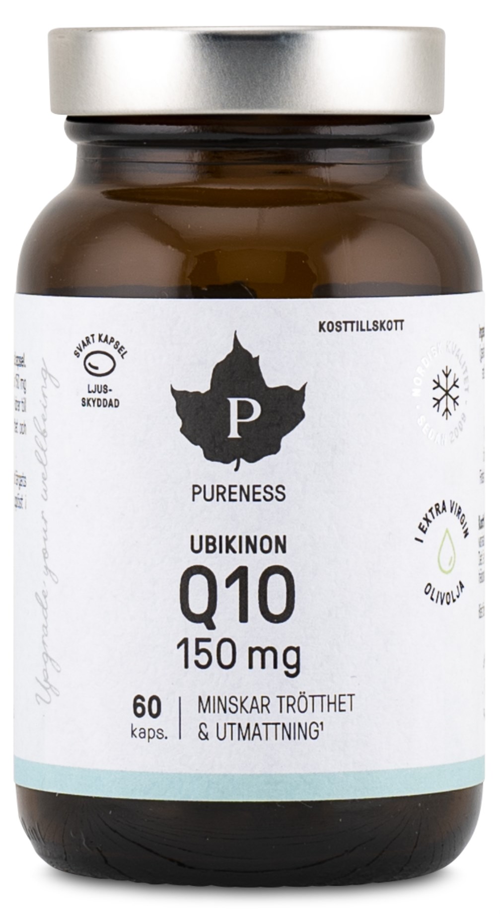 Ubikinon Q10 fra Pureness er et tilskud med Q10 med koldpresset ekstra jomfruolivenolie. En gelatinekapsel indeholder 150 mg fermenteret ubikinon og 15 mg C-vitamin. C-vitamin bidrager blandt andet til normal energiomsætning og til at mindske udmattelse og træthed. Q10 er opløst i højkvalitets, ekstra jomfruolivenolie inde i kapslen. Da Q10 er lysfølsomt, er kapslens skal farvet sort ved hjælp af vegetabilsk kul.