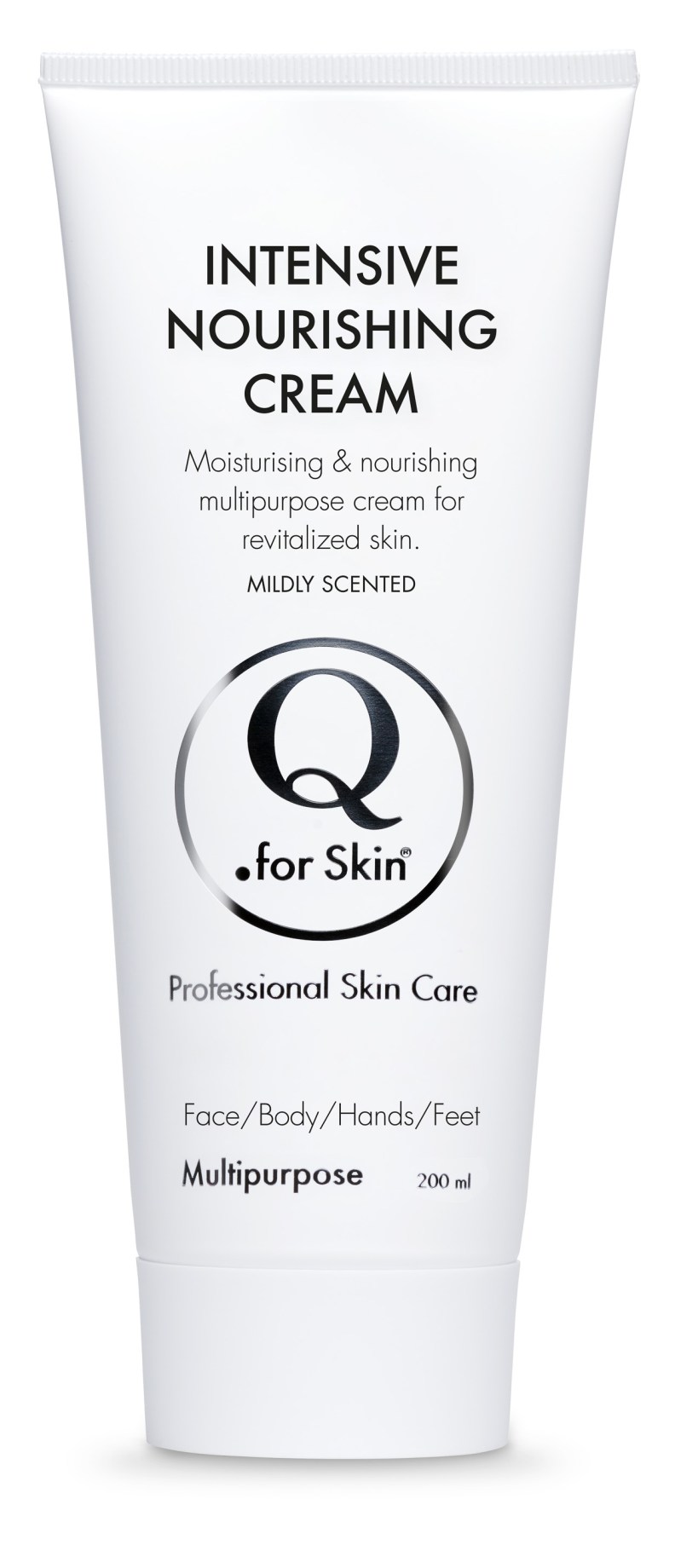 Q for Skin Intensive Nourishing Cream er en fugtgivende creme, der både kan bruges på kroppen og i ansigtet. Cremen giver intensiv fugtighed, samtidig med at den vitaliserer huden og giver den glød. Med solbærfrøolie, vitamin B5 og ekstrakt fra probiotiske bakterier. Intensive Nourishing Cream har en mild og naturlig duft og gør huden silkeblød.