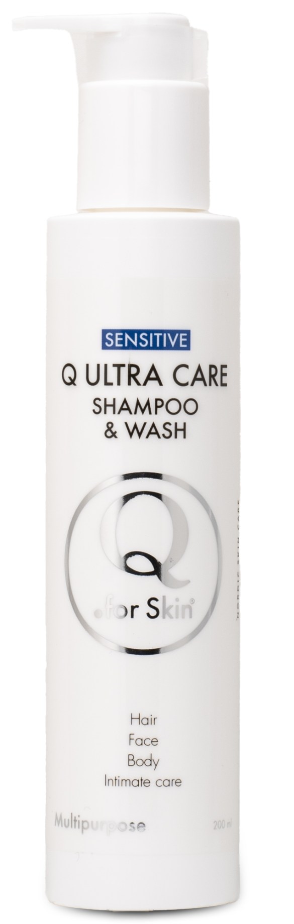 Q for Skin Q Ultra Care er en skånsom og alsidig multivask, der fungerer som shampoo, sæbe og intimvask i ét. Med tensider fra kokos, næring fra havre, Aloe vera og vitamin B5 virker den fugtgivende og styrkende på både hud og hår. Q Ultra Care er velegnet til daglig brug som en del af din vaskerutine.