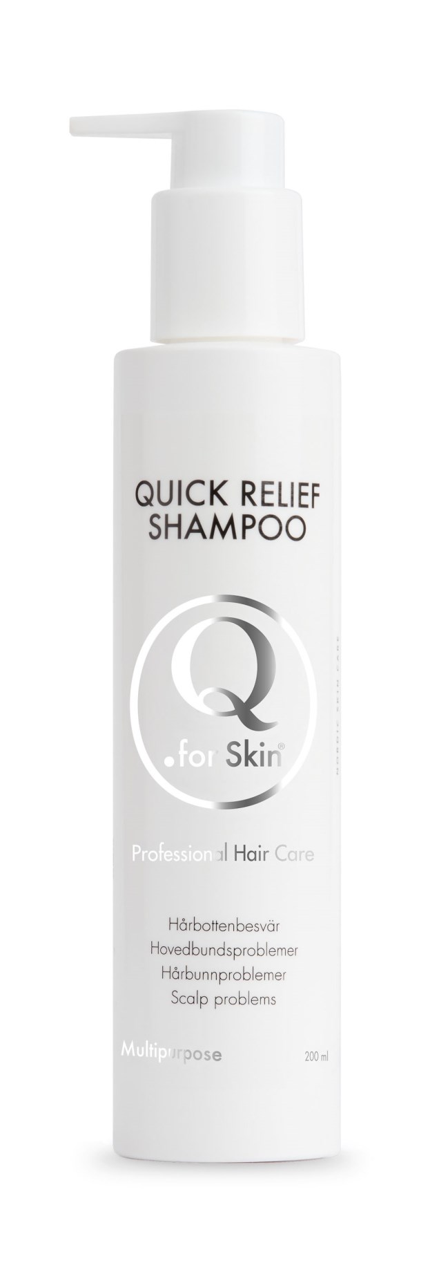 Quick Relief Shampoo fra Q for Skin er en beroligende og balancerende shampoo med milde vaskestoffer fra kokos. Håret bliver blødt, glansfuldt og let at håndtere, og hovedbunden får en balancerende kur, der fremmer mikrofloraen. Shampooen er specielt udviklet til dig, der lider af skæl, belægninger, tørhed eller kløe i hovedbunden.