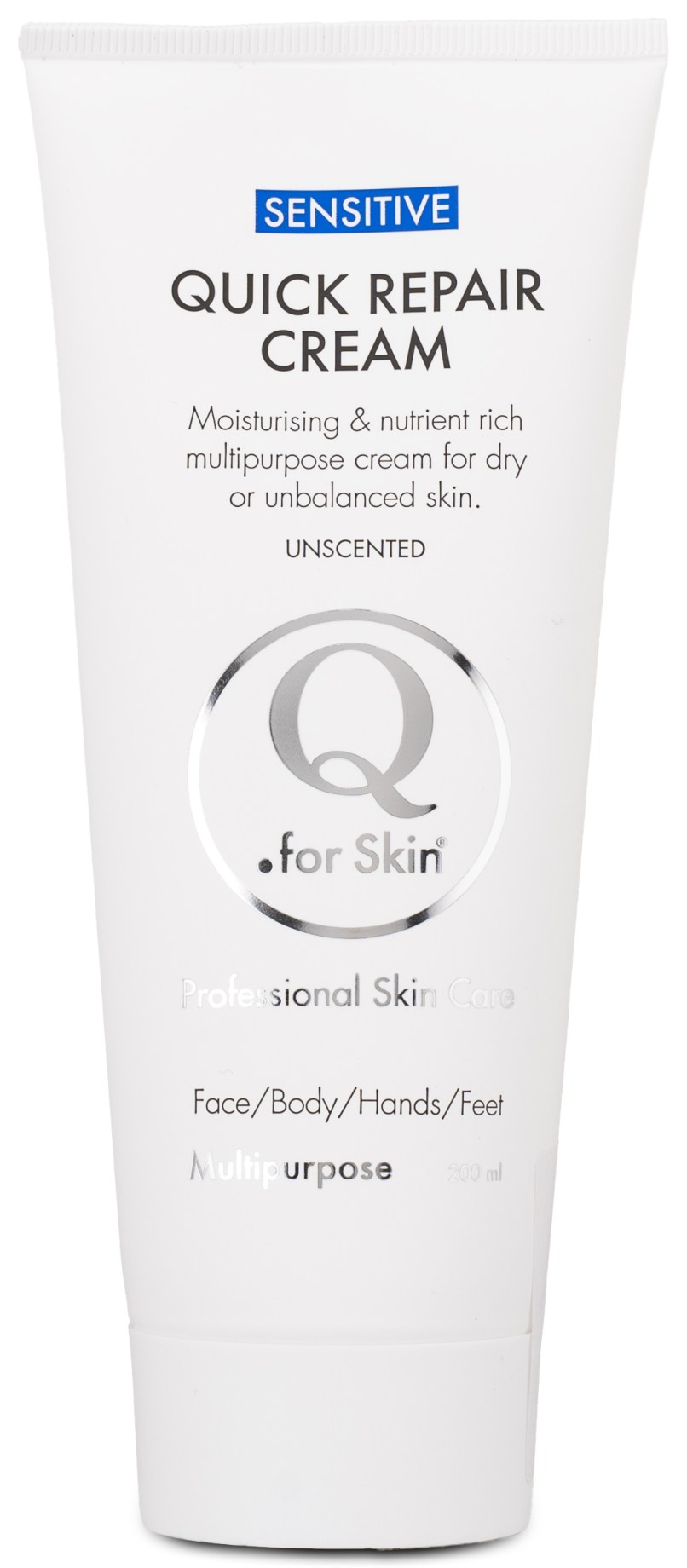 Q for Skin Quick Repair Cream er en nærende og behagelig creme til både ansigt og krop. Cremen er uparfumeret og specielt udviklet til at behandle tør, sensitiv og ubalanceret hud. Solbærfrøolien er en innovativ ingrediens, der giver huden vigtige fedtsyrer for at genoprette balancen. Cremen indeholder også ekstrakt fra probiotiske bakterier, som hjælper med at styrke hudens naturlige beskyttelsesbarriere. Hudcremen er ideel til tør hud med revner eller sensitiv hud, der har brug for fugt. Den kan bruges overalt - ansigt, krop, hænder eller fødder.