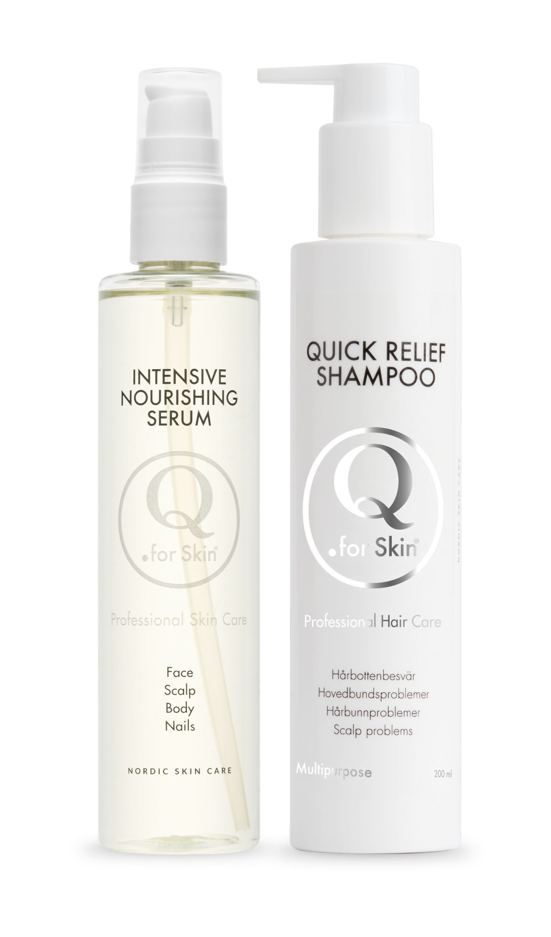 Startpakke Hovedbundsbesvær indeholder en komplet duo, der sammen løser den grundlæggende årsag til dine problemer. Produkterne er udviklet sammen med frisører og henvender sig til personer, der ønsker at slippe af med tør hovedbund, skæl, kløe, flager eller belægninger i hovedbunden - problemer, der ofte opstår, når mikrofloraen er i ubalance. Quick Relief Shampoo genopretter mikrofloraen i hovedbunden, mens Intensive Nourishing Serum tilfører næring og genopretter hovedbundens naturlige fedtstoffer. Brug som en kur i to uger, derefter efter behov.