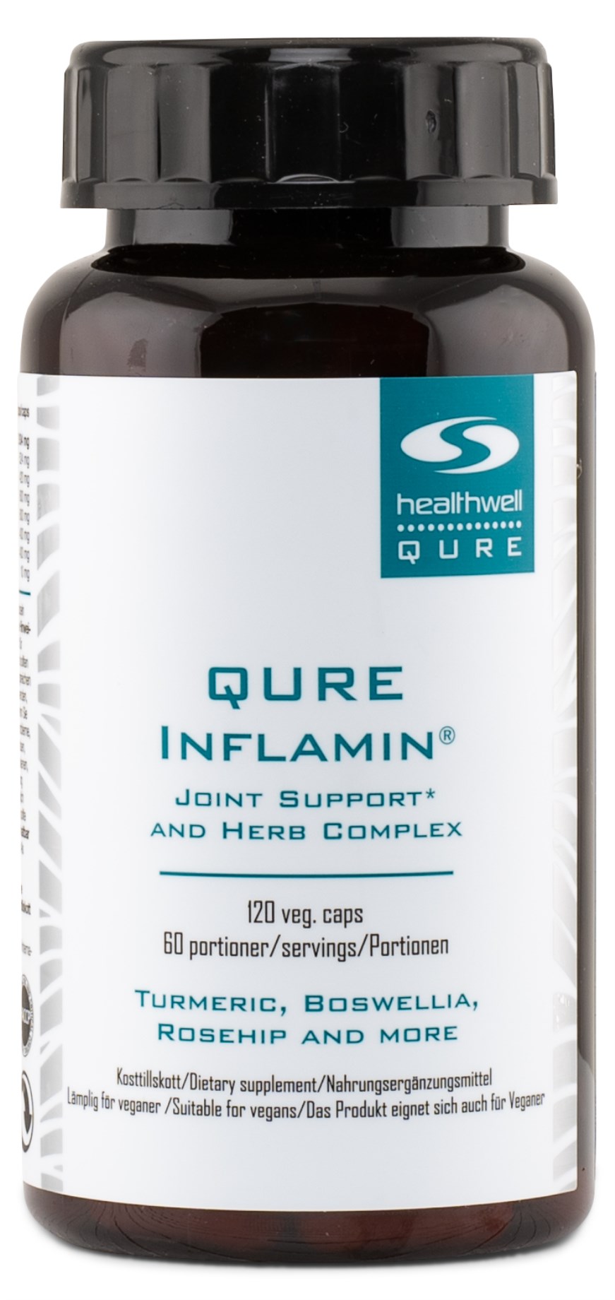 QURE Inflamin® er et ekstra højdoseret supplement med en lang række velkendte standardiserede urter og planter. I dette kompleks indgår blandt andet et fuldspektrumekstrakt af hyben, som ofte er en almindelig ingrediens i tilskud for led, og som er naturligt rig på vitamin C. QURE Inflamin® indeholder også en høj dosis curcumin fra den enormt populære urt gurkemeje, forstærket med sort peber ekstrakt for at optimere optagelsen. Andre velkendte urter er Boswellia serrata med sit indhold af boswelliasyre samt ingefær som indeholder gingeroler. QURE Inflamin® passer til dig, der ønsker et aktivt liv på en nem måde. Da alle ingredienser er højdoserede, behøver du ikke supplerer dit indtag med flere separate tilskud - med QURE Inflamin® får du alt i en og samme kapsel!