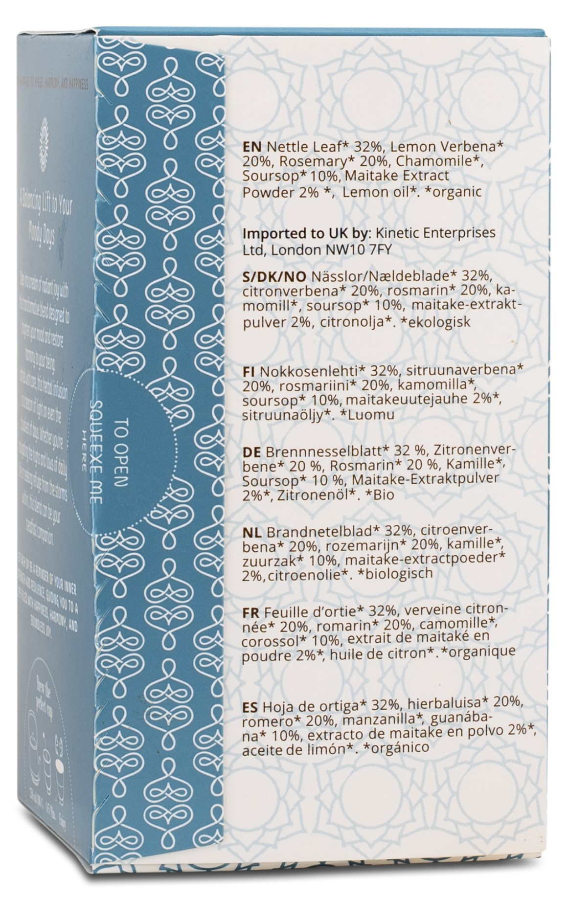 Oplev en mild og opkvikkende stund for alle dine sanser med denne omhyggeligt udvalgte blanding af blandt andet brændenælde, kamille og maitake, skabt for at forbedre dit humør og give en følelse af ro. Teen er nænsomt fremstillet for at give en behagelig stund, selv på de tungere dage. Uanset om du ønsker at håndtere hverdagens stress eller søger lidt indre ro, kan Herbal Te Moody Blues Maitake give en lille pause. Smagen er jordagtig og blomsteragtig med citrusnoter, hvilket giver en forfriskende følelse.