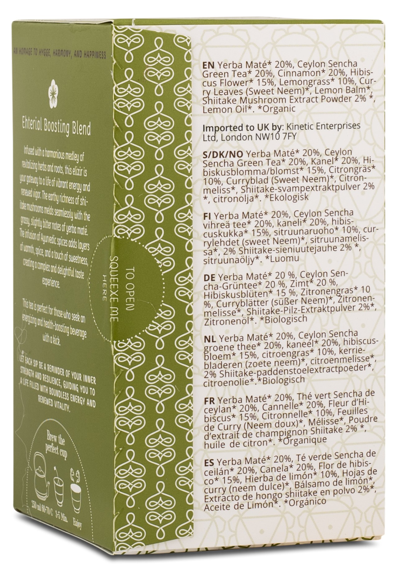 Rå Hygge Yerba Mate Magic Shiitake er en velafbalanceret teblanding med spændende shiitake-svamp ekstrakt, yerba maté og sencha-grøn te. En kombination, der kan give dig både energi og ro på samme tid! Teen har en spændende smagsprofil, hvor en jordagtig fyldighed fra shiitake harmonerer fint med yerba maténs græsagtige, let bitre toner. Ayurvediske krydderier tilføjer varme, krydderi og en subtil sødme, der skaber en kompleks og nydelig smagsoplevelse. Yerba Mate Magic Shiitake er et fremragende alternativ til koffeinholdige drikkevarer – perfekt når du har brug for lidt ekstra energi om morgenen eller under eftermiddagspausen!