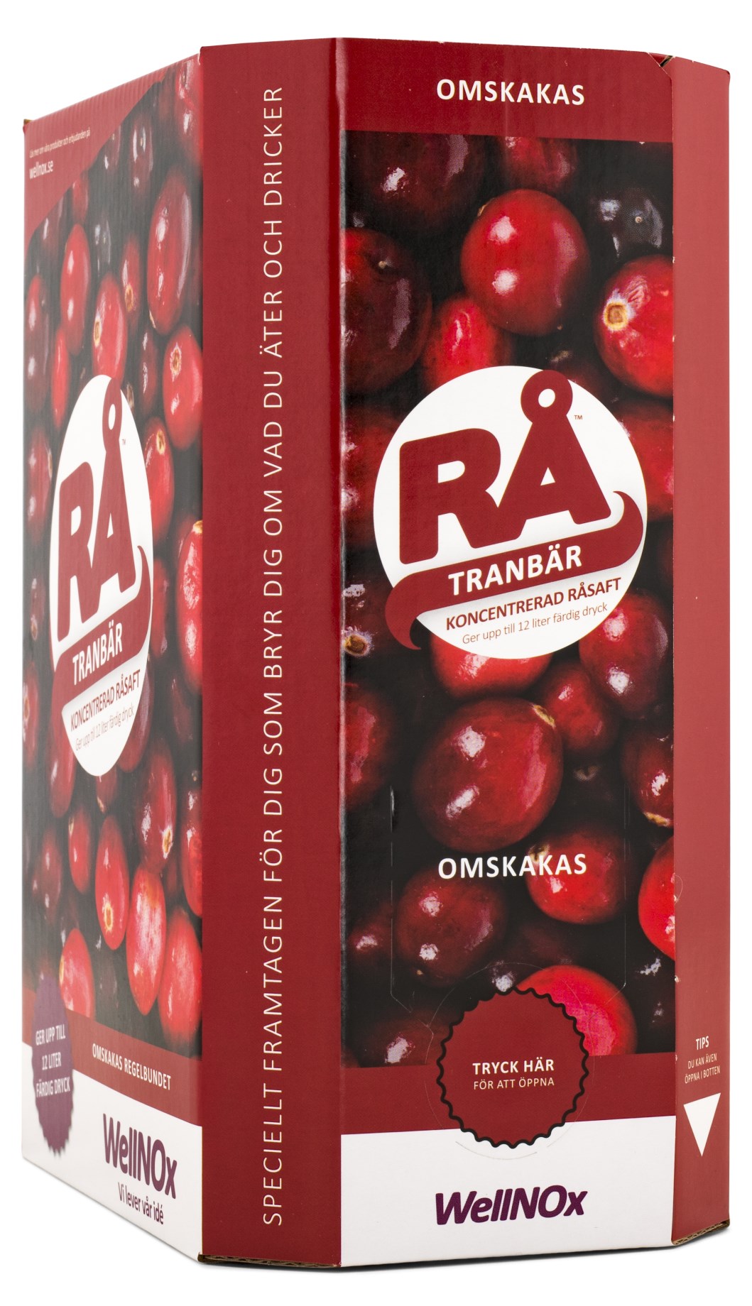 RÅ Tranebær indeholder 100 % usødet tranebærkoncentrat og er helt fri for konserveringsmidler og andre tilsætningsstoffer. Fortynd 1:4 eller 1:8 som en velsmagende og sund måltidsdrik, eller drik den, som den er. Takket være den tætsluttende emballage holder den praktiske bag-in-box sig frisk i mindst en måned efter åbning. Bemærk, at smagen kan variere lidt mellem forskellige sæsoner.