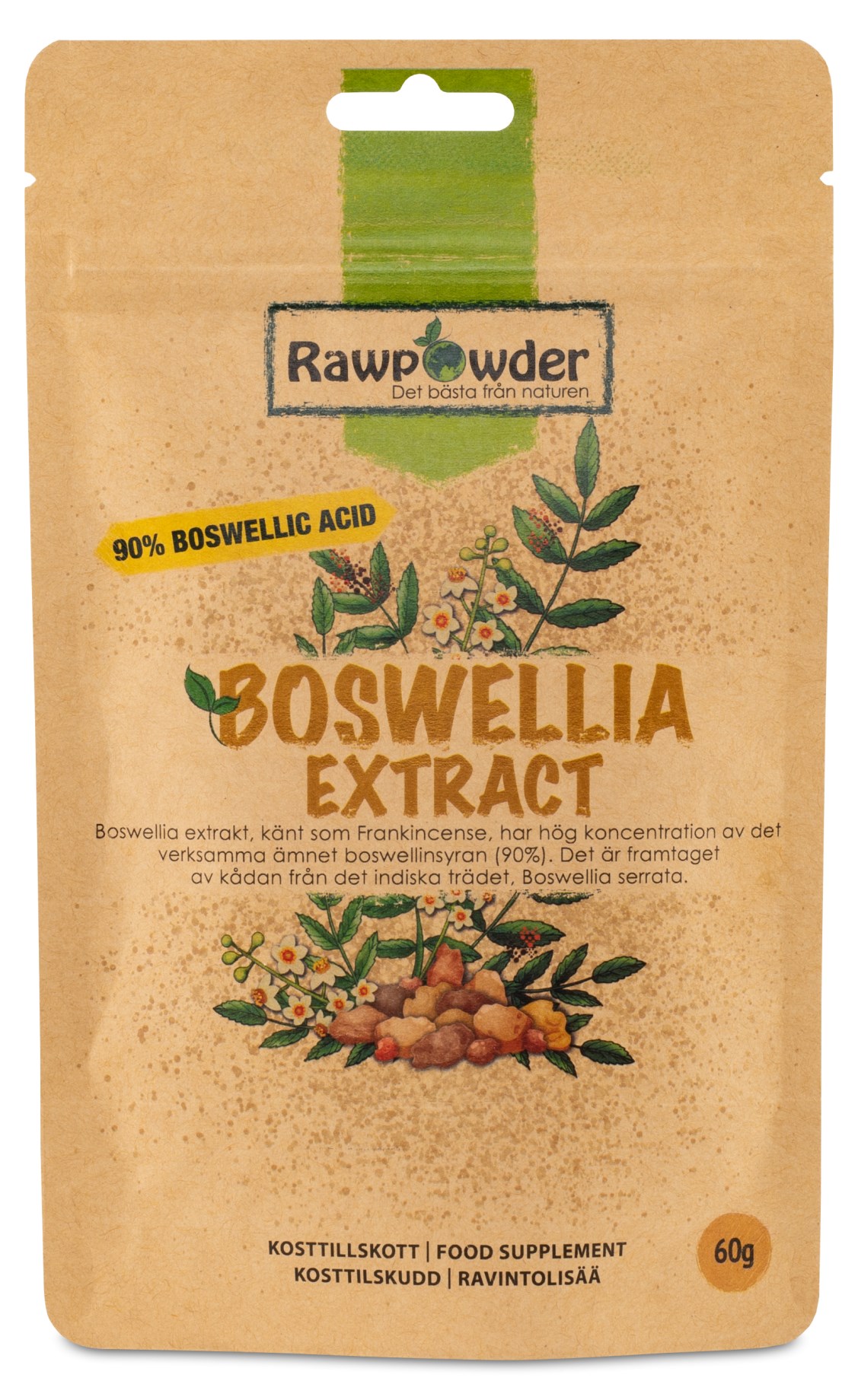 Rawpowder Boswelliaekstrakt leveres i pulverform som et kosttilskud. Boswellia serrata er et velkendt træ, der vokser i både Afrika og Asien. Det er kendt som Frankincense og stammer fra harpiksen på det indiske boswelliatræ. Det er længe blevet brugt af hinduer i Ayurveda, for at hjælpe med forskellige betændelser. Ekstrakten har en høj koncentration af det aktive stof boswellic acid, op til 90%. Du kan let opløse ekstrakten i vand, og du kan også blande det i juice eller i en smoothie.