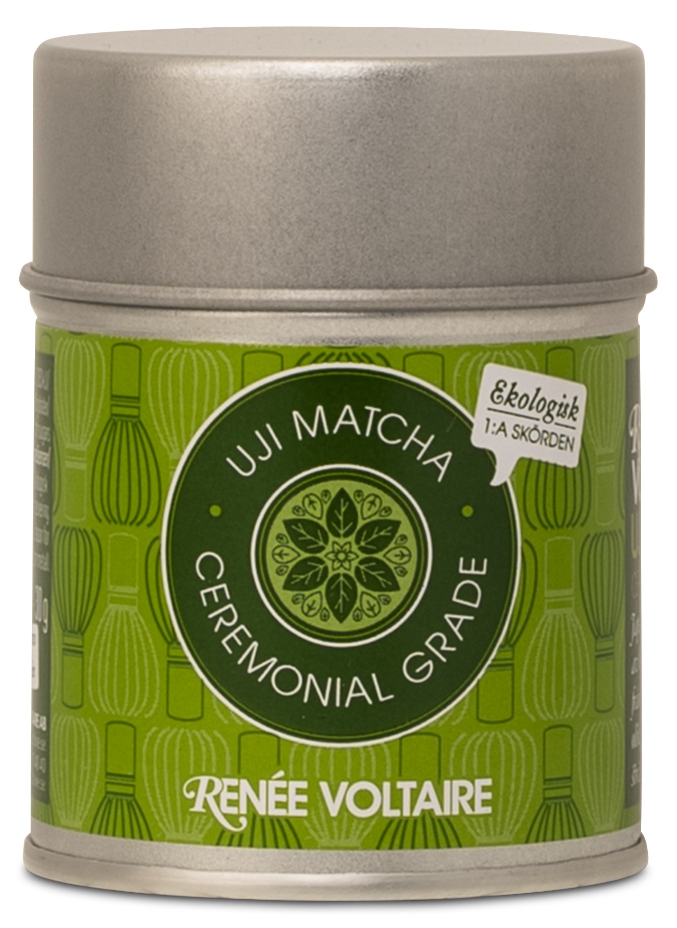 Renee Voltaire Uji Matcha Ceremonial Grade A er et matchapulver, der er 100 % økologisk og kommer fra Japan. Det er en såkaldt grade A-te, der vidner om dens høje kvalitet. Matcha er en finmalet grøn te, hvor man har brugt hele tebuskens blade ved fremstillingen. I Japan betragtes det som en af verdens fineste teer, og det anvendes, udover som te, ofte i bagværk, madlavning og til forskellige drikkevarer.
