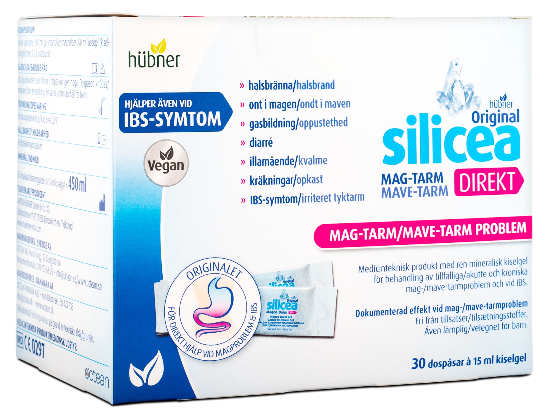 Silicea Mave-Tarm Direkt hjælper dig, når du har problemer med oppustet mave eller luft i maven. Hvis du ofte lider af urolig mave eller har tarmproblemer, kan du få hjælp af Silicea Mave-Tarm. Silicea Mave-Tarm Direkt indeholder kiselgel i form af fintmalet kisel, som sammen med vand og syre har en positiv effekt på en oppustet mave. Geléen har en bindingsevne og binder dermed gasser og andre substanser i maven og tarmene. Kiselgel har også en beskyttende effekt på slimhinderne og hjælper med at lindre forskellige former for mave- og tarmproblemer såsom IBS og halsbrand. Poserne er små og praktiske at have med på rejsen, og produktet kan også anvendes af børn.