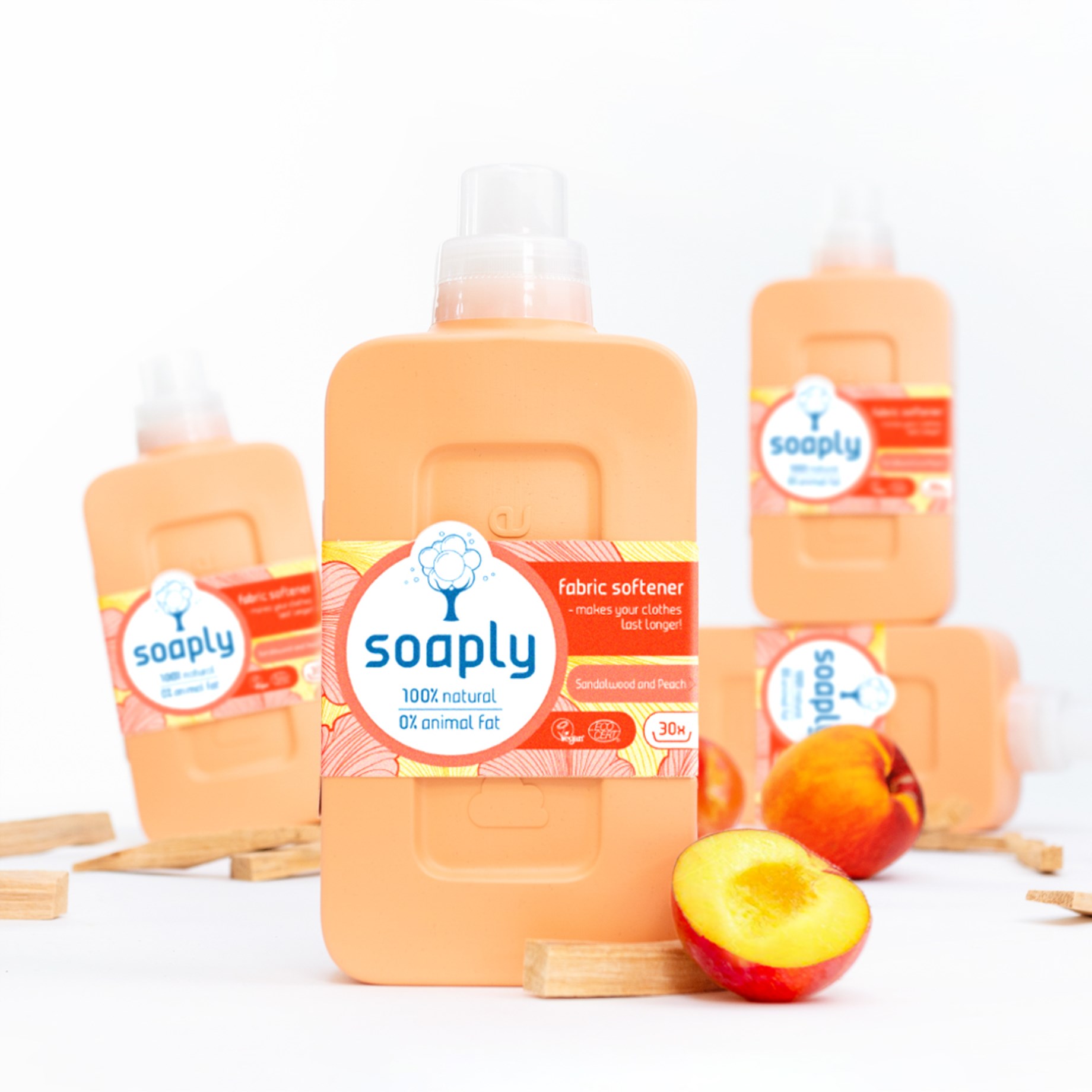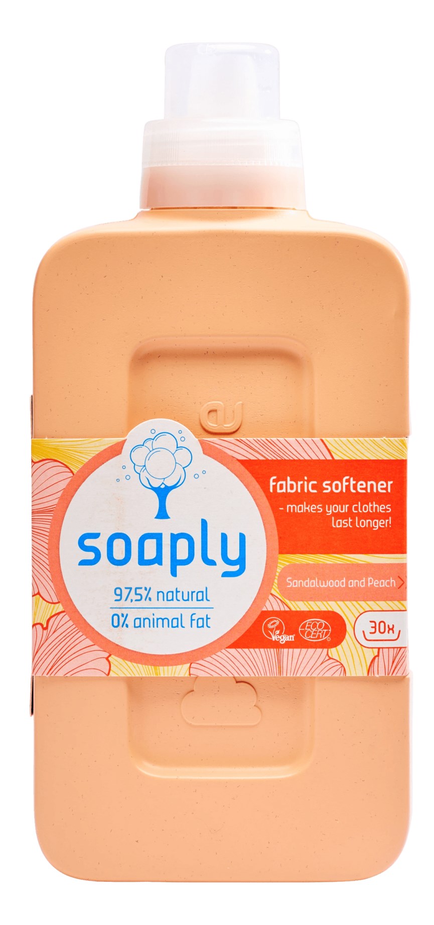 Soaply Skyllemiddel Sandalwood & Peach er et cremet, blødgørende skyllemiddel, der giver en subtil duft. Skyllemidlet indeholder 97,55% naturlige ingredienser, er helt vegansk og fri for mikroplastik og passer til alle typer af vasketøj. Få en blød og behagelig følelse på tøj og andet vasketøj med Soaplys skyllemiddel!
