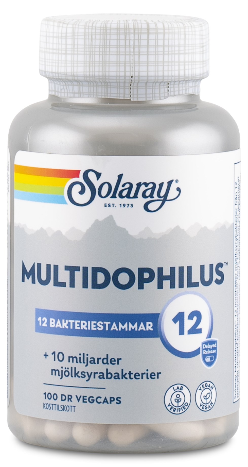 Solaray Multidophilus 12 er fyldt med gode bakterier og indeholder mælkesyrebakterier fra 12 udvalgte stammer. Den anbefalede daglige dosis er 2 kapsler, hvor hver kapsel indeholder hele 10 milliarder mælkesyrebakterier. Blandt andet bakteriearten L.bulgaricus og S. thermophilus, som længe har været anvendt i yoghurtproduktion for deres produktion af mælkesyre og fordøjelsesenzymet laktase. Kapslen er en såkaldt DR-kapsel, hvilket står for "Delayed Release". Det betyder en forsinket frigivelse, så bakterierne tåler mavesyren og frigives først i tarmen. Multidophilus indeholder også inulin, som hjælper bakterierne med at overleve og formere sig lettere.