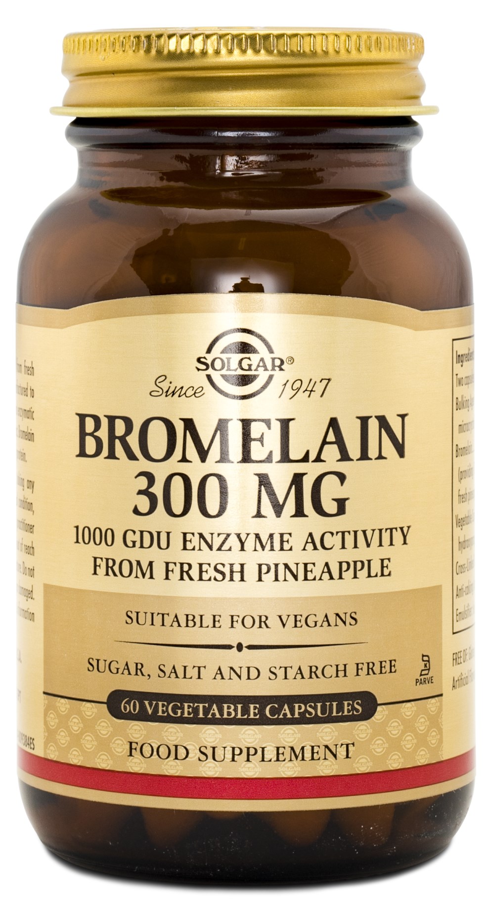 Solgar Bromelain 300 mg indeholder det proteinnedbrydende enzym bromelain, også kaldet bromelain. Dette enzym udvindes fra ananas og er blandt andet grunden til, at nogle mennesker kan opleve en kløende følelse i munden, når de spiser ananas. Solgar Bromelain 300 mg bruges i forbindelse med pollenallergi fra for eksempel græs- eller bjørkepollen. Dette kan for eksempel være hævelse af slimhinderne, især i næsen og bihulerne. Brug Solgar Bromelain 300 mg mellem måltiderne for at optimere dens virkning. Hvis du vil bruge bromelain i stedet for at hjælpe med at nedbryde mad, skal du tage kapslerne med et måltid.
