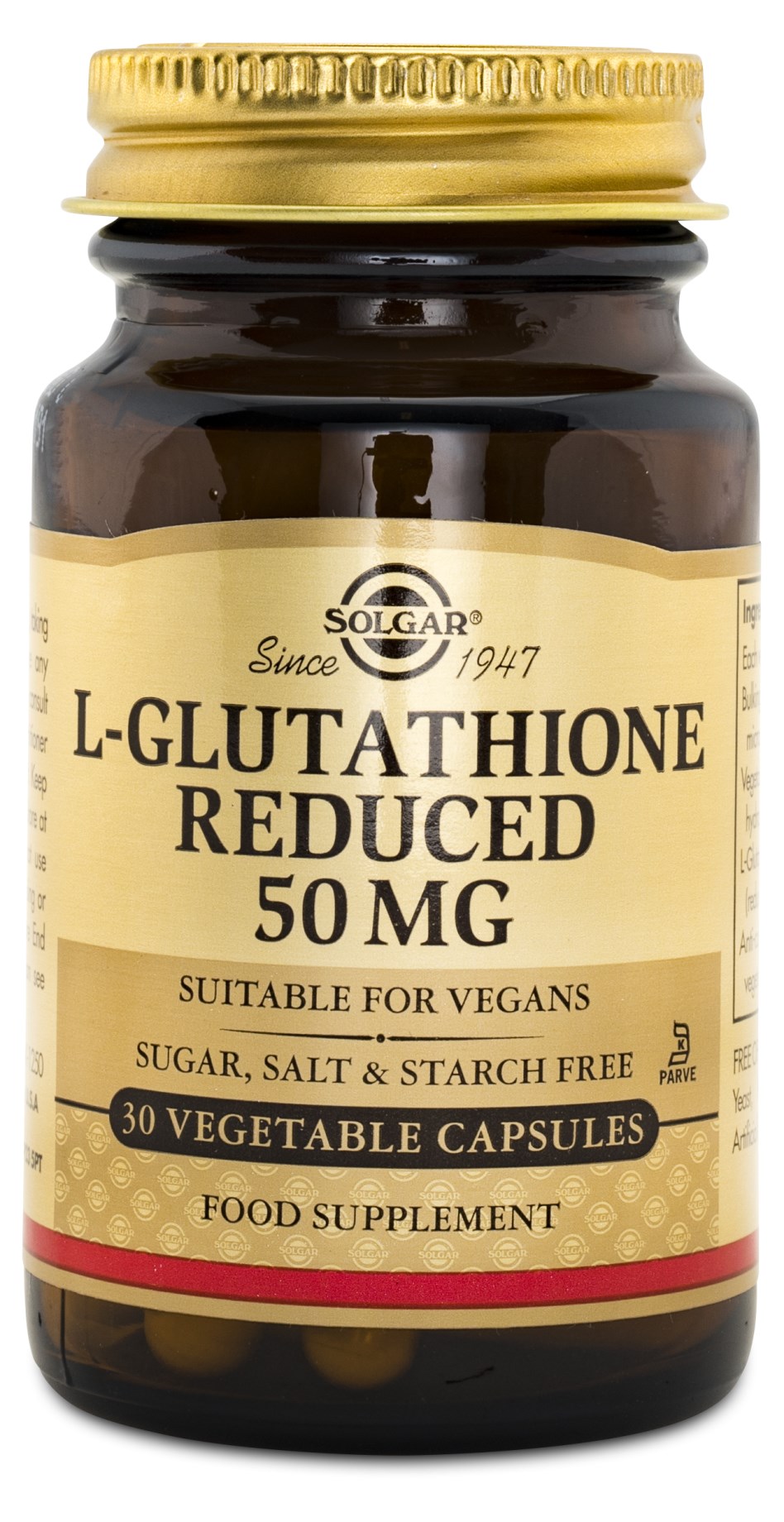 Solgar L-Glutathione 50 mg er kapsler med L-glutation, det vil sige en kombination af aminosyrerne glutaminsyre, cystein og glycerin. Aminosyrerne har blandt til formål at fungere som byggesten i dannelsen af protein i kroppen, ydermere er de nødvendige for en række kropslige funktioner. Glutation fungerer som en antioxidant og beskytter cellerne mod at blive nedbrudt af frie radikaler. Andre opgaver, som aminosyrerne kan have, er at danne enzymer, signalstoffer og antistoffer. Solgar L-Glutathione indeholder 50 mg reduceret glutation per kapsel og tages dagligt for at opnå bedste effekt.