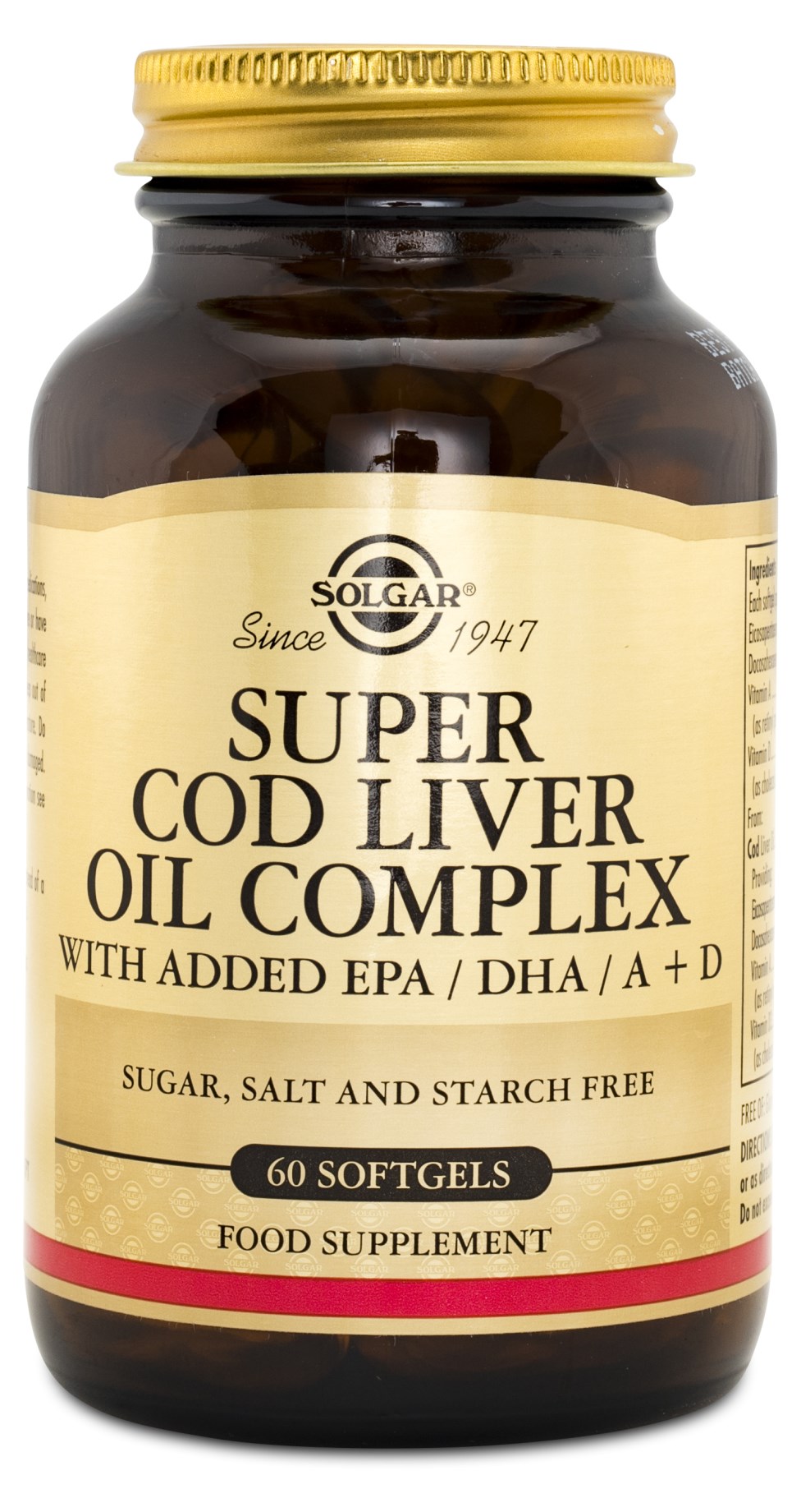 Solgar® Super Cod Liver Oil Complex er kapsler, der indeholder sunde fedtsyrer fra torskeleverolie kombineret med vitamin A og D. Torskeleverolie indeholder omega-3-fedtsyrerne DHA og EPA, som blandt andet bidrager til god hjerte-kar-sundhed og reduceret risiko for blodpropper. Kapslerne er også forstærket med ekstra DHA og EPA. A-vitamin bidrager igen til normale slimhinder, normalt syn og til hudens velbefindende, mens D-vitamin bidrager til immunsystemet, reguleringen af calcium og normal muskelfunktion. Fiskeolien i Solgar® Super Cod Liver Oil Complex er produceret af dybhavsfisk fra virkelig kolde hav, hvilket anses for at øge kvaliteten af olien. Kapslerne er såkaldte bløde geler, som er en blødere variant af almindelige kapsler, der er behagelige at sluge.