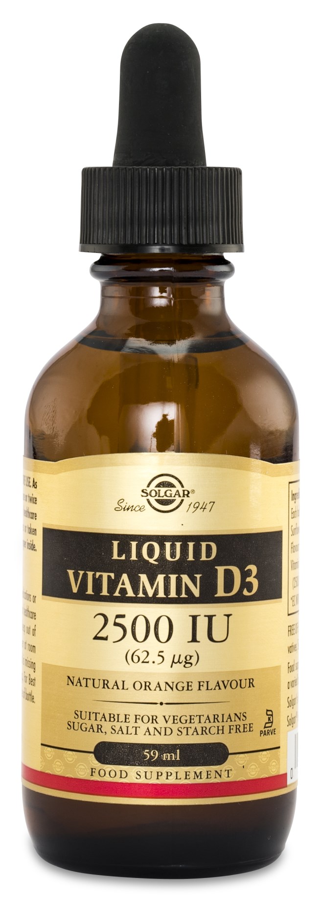 Hvem bliver ikke opmuntret og glad af at være i solen? Solgar® Vitamin D3 Liquid 2500 IE er flydende solskin på flaske. Det er fra solen, vi får vores boost af D-vitamin, og her i Norden har vi svært ved at få nok i vintermånederne. Vi har brug for D-vitamin til mange funktioner i kroppen, heriblandt for at immunsystemet fungerer normalt og for at opretholde en normal knoglestruktur. Dette flydende D-vitamin fra Solgar® har appelsinsmag og tilsat solsikkeolie for den bedst optagelse. Kun få dråber er nødvendige for at dække det daglige behov, og en flaske rækker til næsten 4 måneder.