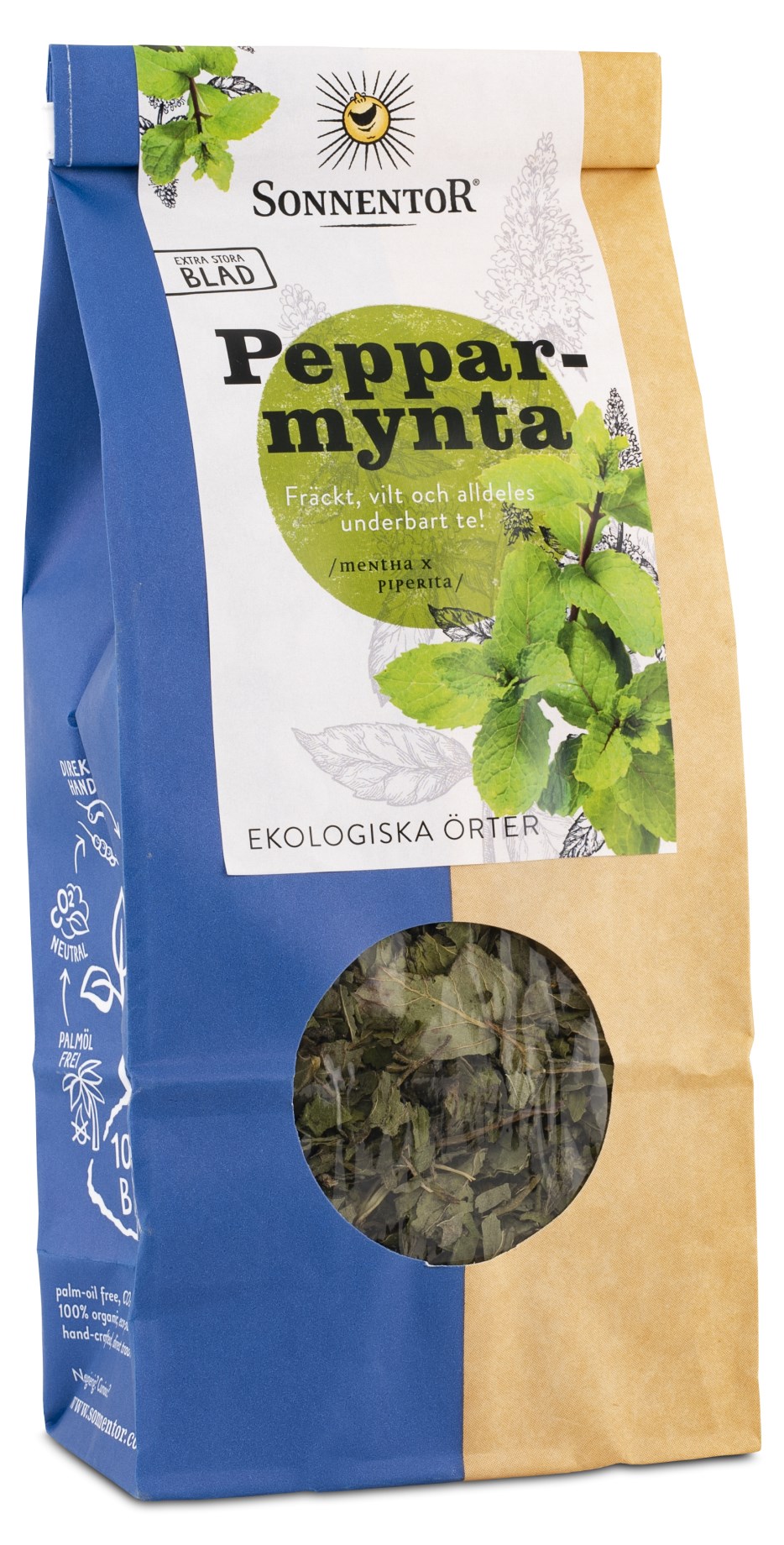 Sonnentor Pebermynte i løsvægt kan bruges som smagsgiver i desserter, slik, madretter eller til en kop te. Sonnentor Pebermynte er tørrede blade fra omhyggeligt udvalgte afgrøder, pakket i hånden og uden tilsætningsstoffer. Derudover er emballagen miljøvenlig. Pebermynte har en velkendt og værdsat forfriskende smag og aroma, og ifølge traditionelle hjemmmidler føles maven godt efter en kop myntete efter måltidet.