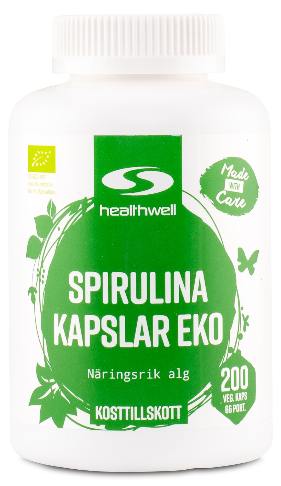 Healthwell Spirulina Kapsler ØKO er et økologisk tilskud med den blågrønne alge spirulina, som er en af vores mest klorofylrige fødevarer. Klorofyl er det, der farver planten grønt og er meget nærende. Udover at spirulinaen også består af over 60% protein med alle de essentielle aminosyrer, så indeholder den også flere vigtige vitaminer og mineraler. Den har blandt andet et højt indhold af jern som bidrager til reduceret træthed, vitamin C og E som virker antioxidant på kroppen og krom som er med til at regulere blodsukkeret. Spirulinaen har også bemærkelsesværdigt høje niveauer af gavnlige omega-fedtsyrer, der virker for hjertets og hjernens normale funktion.