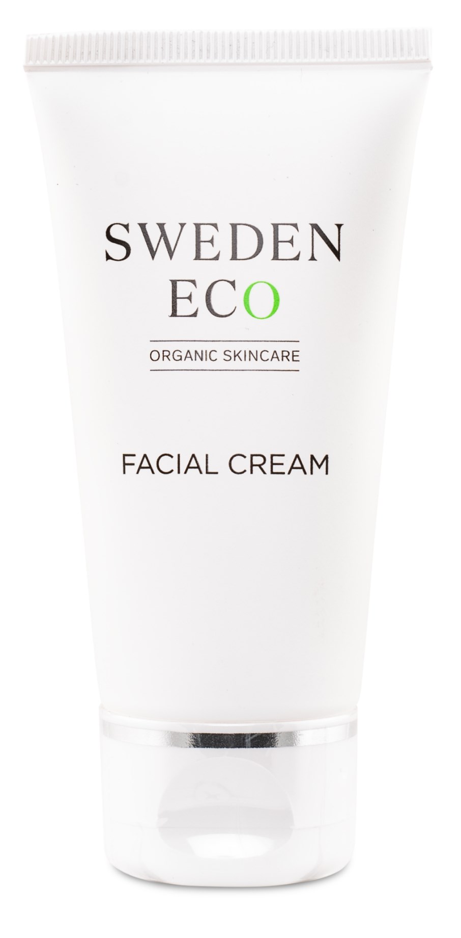 Organic Skincare Facial Cream fra Sweden Eco Skincare er en naturlig dag- og natcreme, der absorberes let og efterlader huden hydreret, blød og smidig. Den beskytter, plejer og hjælper med at reducere tegn på træthed og livløshed i huden ved hjælp af fair trade aloe vera. Indeholder paracress, som har dokumenteret effekt til at øge hudens fasthed og mindske synlige linjer. Cremen har en mild frugtig duft.