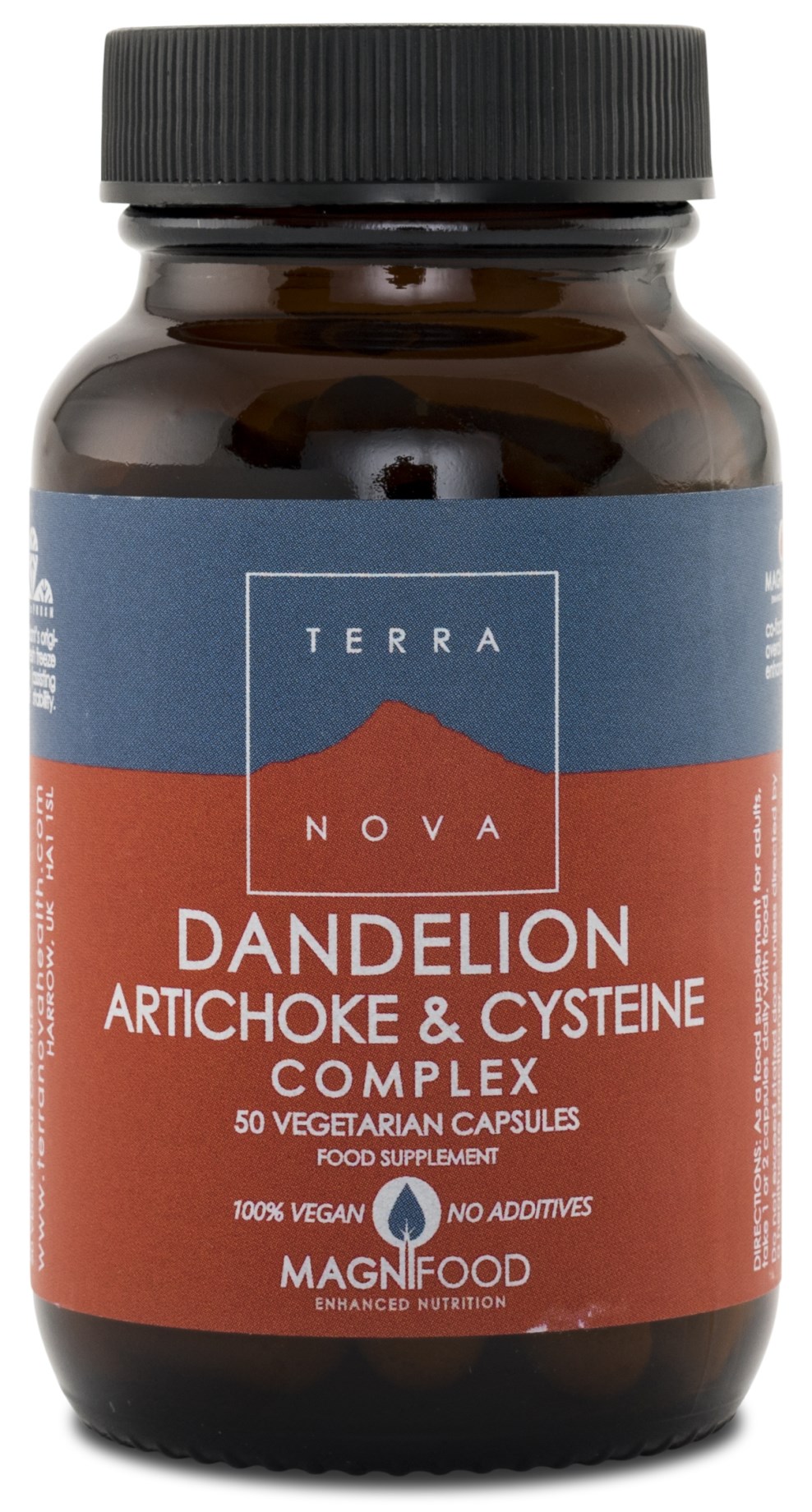 Terranova Dandelion, Artichoke & Cystein Complex er et naturligt kosttilskud med en unik sammensætning af mælkebøtte, artiskok og cystein. Mælkebøtte er en urt, der har et naturligt indhold af bitre stoffer og mineraler og anses for at have en positiv effekt på fordøjelsen, hvilket artiskok også anses for at have. L-Cystein er en svovlbærende aminosyre, som kroppen også producerer på egen hånd og findes naturligt i hår, hud og negle. Terranova Dandelion, Artichoke & Cysteine Complex indeholder også gurkemeje, grøn te, grønnkål, byggræs og stabiliseret risklid.