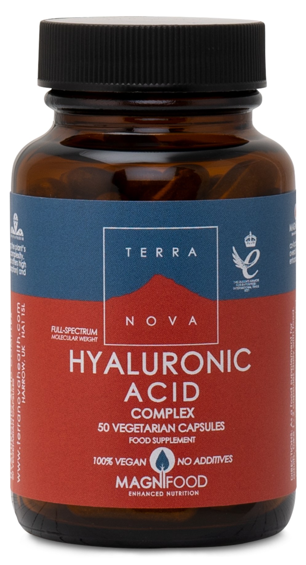 Terranova Hyaluronic Acid Complex er en nem måde at indtage hyaluronsyre på og dermed drage fordel af dets egenskaber. Hyaluronsyre opretholder fugtbalancen i huden ved effektivt at binde fugt til sig, hvilket fører til en velfugtet, elastisk og blød hud. Derudover findes hyaluronsyre i bruskvævet, hvor det har en vigtig, stødabsorberende funktion. Terranova Hyaluronic Acid Complex indeholder ingen konserveringsmidler eller tilsætningsstoffer, men er forstærket med Magnifood Complex, en speciel sammensætning af tørrede planter og bær, der bidrager til en normal optagelse af hyaluronsyren.