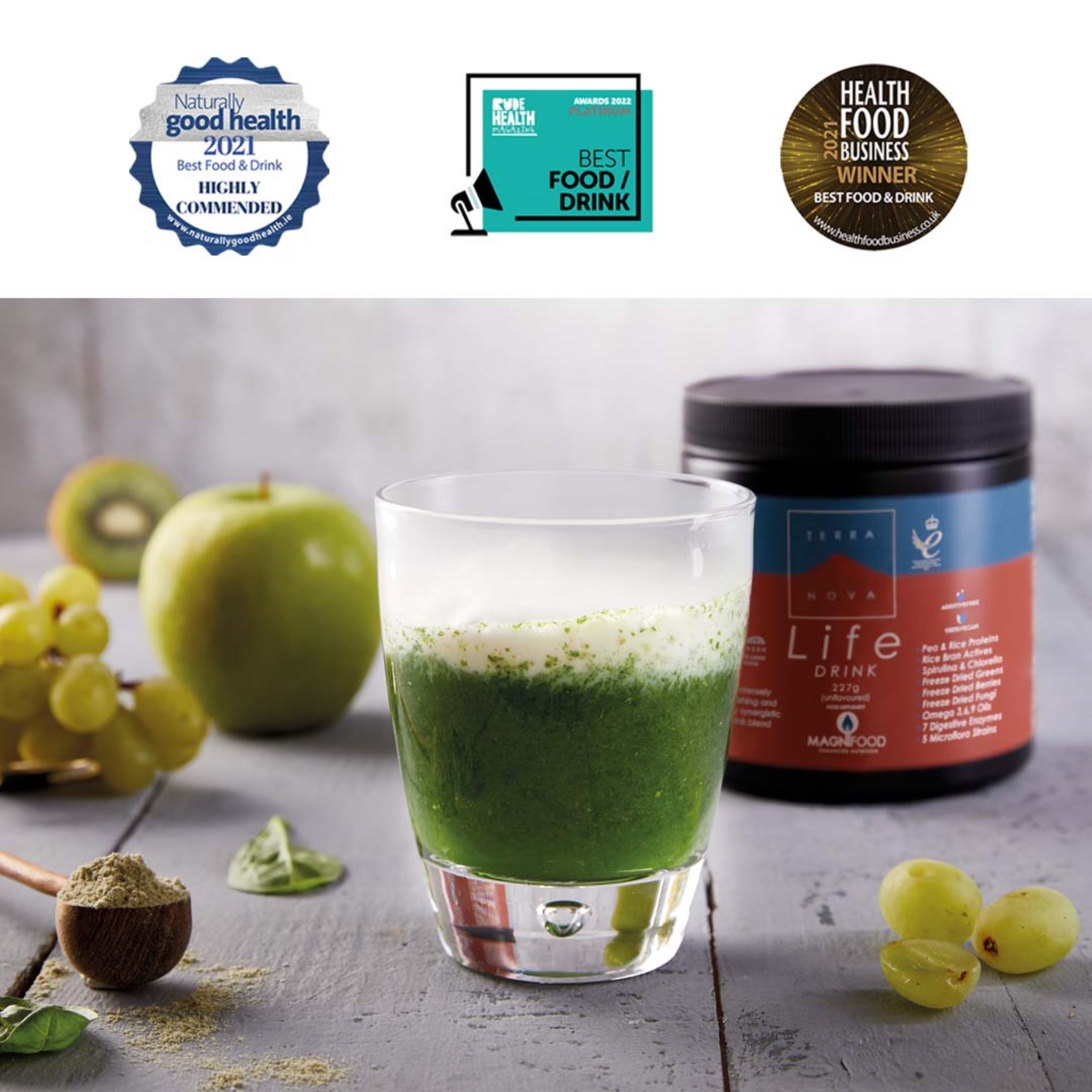 Terranova Life Drink er specielt udviklet til at være så nærende som muligt med en bred vifte af tiltrængte næringsstoffer. Blandingen indeholder plantepulver fra nogle af naturens mest nærende planter, alger og grøntsager, en bærblanding med især antioxidantrige bær og vegetabilsk protein, herunder bønne- og risprotein. Desuden indeholder den mavevenlige mælkesyrebakterier og omega-fedtsyrer.