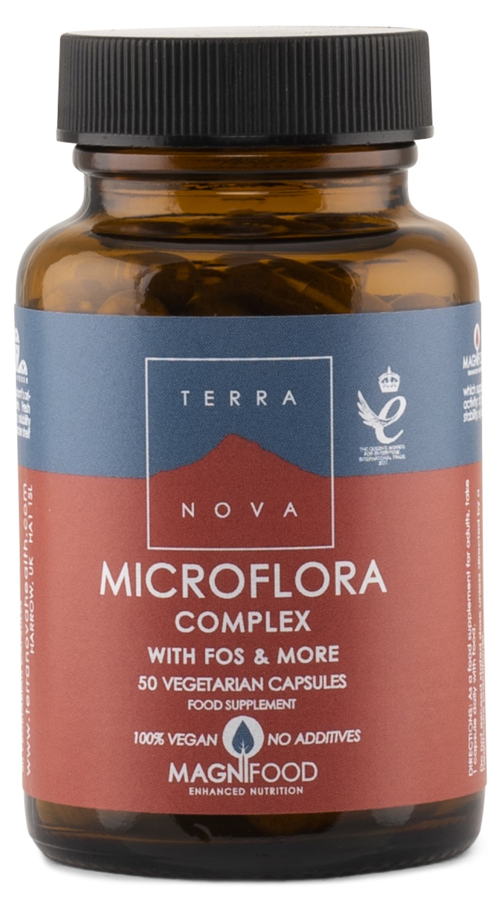 Få bugt med din urolige mave med Terranova Microflora Complex with FOS. Terranova Microflora Complex er et tilskud med fem forskellige bakteriestammer for at hjælpe dig med at få balance i tarmfloraen og maven, så fordøjelsen bliver mere parat til at bearbejde næringen i kosten. Terranova Microflora Complex indeholder også Magnifood® Complex, som er en blanding af rødbede, risklid og burre, der hjælper med at forbedre tarmfloraen.