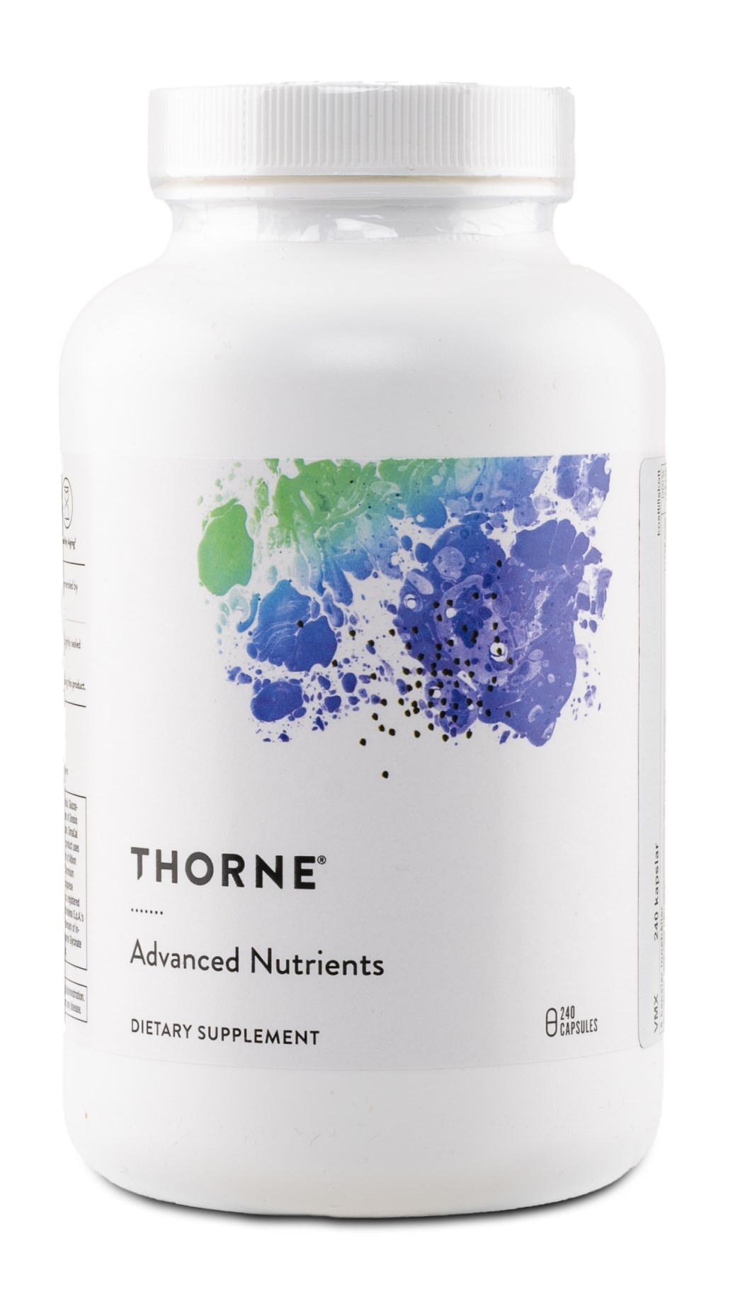 Thorne Advanced Nutrients er et kosttilskud, der kombinerer vitaminer og mineraler for at støtte kroppen, især under perioder med stress og andre belastninger. Ingredienserne inkluderer blandt andet blåbærekstrakt, trans-resveratrol, nikotinamid, aktive B-vitaminer og andre næringsstoffer, der er vigtige for optimal sundhed.