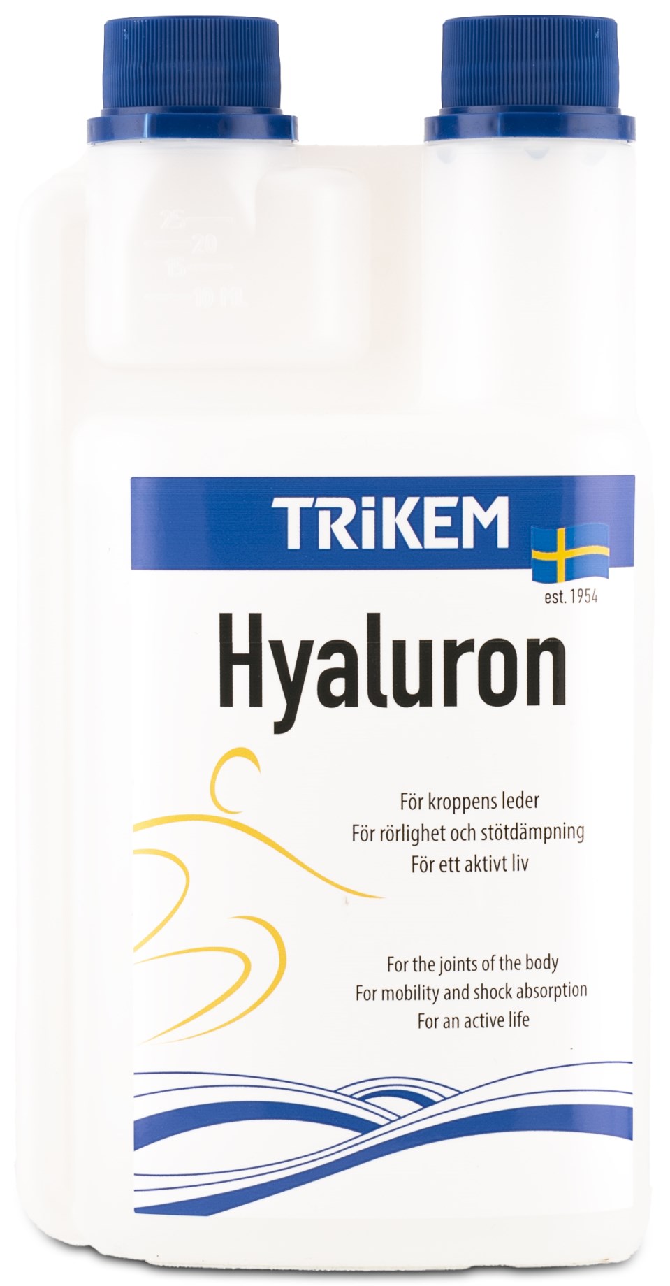 Trikem Human Hyaluron er flydende hyaluronsyre specielt udviklet til mennesker, ideel til dig, der er meget aktiv eller har udsat kroppens led for belastning gennem længere tid. Selv hvis du er ved at komme op i alderen, kan du bruge Trikem Human Hyaluron for at bevare din ledsundhed. Hyaluronsyre er et stof, kroppen selv producerer, men mængden mindskes med alderen. Det findes blandt andet i ledvæsken og er nødvendigt for, at vores led fungerer optimalt. En af hyaluronsyrens egenskaber er dens evne til at tiltrække vand, hvilket øger viskositeten i ledvæsken. En sund ledvæske med høj viskositet hjælper med at beskytte vores led bedre mod kraftige stød og opretholder bevægeligheden. Trikem Human Hyaluron indeholder naturlig og høj molekylær hyaluronsyre og er fremstillet i Sverige. Trikem Human Hyaluron er nem at dosere og har en god citronsmag.