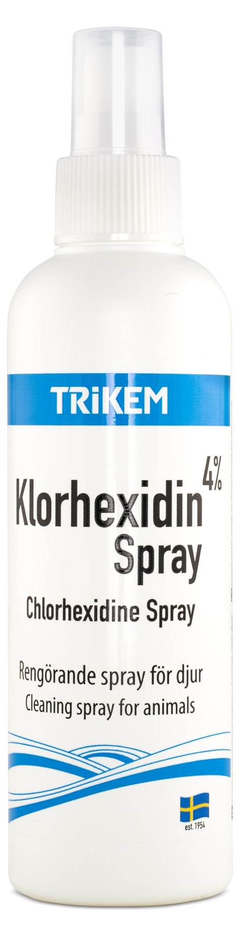 Trikem Klorhexidinspray er en antiseptisk og rengørende spray til hest og hund, der er velegnet til mindre hudskader eller udslæt i pels og på poter. Sprayen er klar til brug og sprøjtes direkte på og omkring skaden. Den indeholder fugtgivende stoffer til gentagne behandlinger.