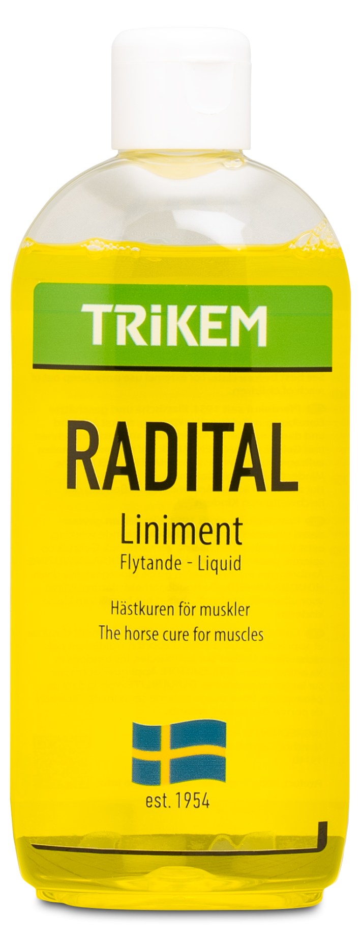 Radital kan anvendes til både mennesker og dyr for at lindre stive og ømme muskler og til forebyggende formål før træning og konkurrence. Massér salven ind i musklerne, og lad den virke. Salven har en dobbeltfunktion, eftersom den fremmer blodomløbet, samtidig med at den lindrer smerten.