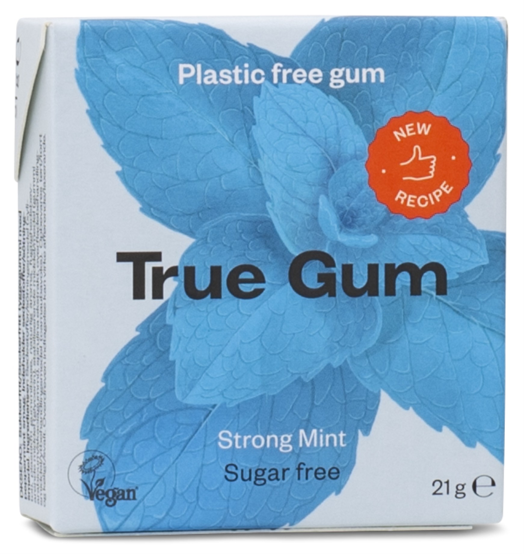 True Gum tyggegummi er et helt naturligt og vegansk tyggegummi, der er plastfrit og 100% bionedbrydeligt. Uden tilsat sukker, kunstige smagsstoffer og konserveringsmidler. Tyggegummiet er lavet på saft fra træer som en gummibase og indeholder plantebaserede sødestoffer.