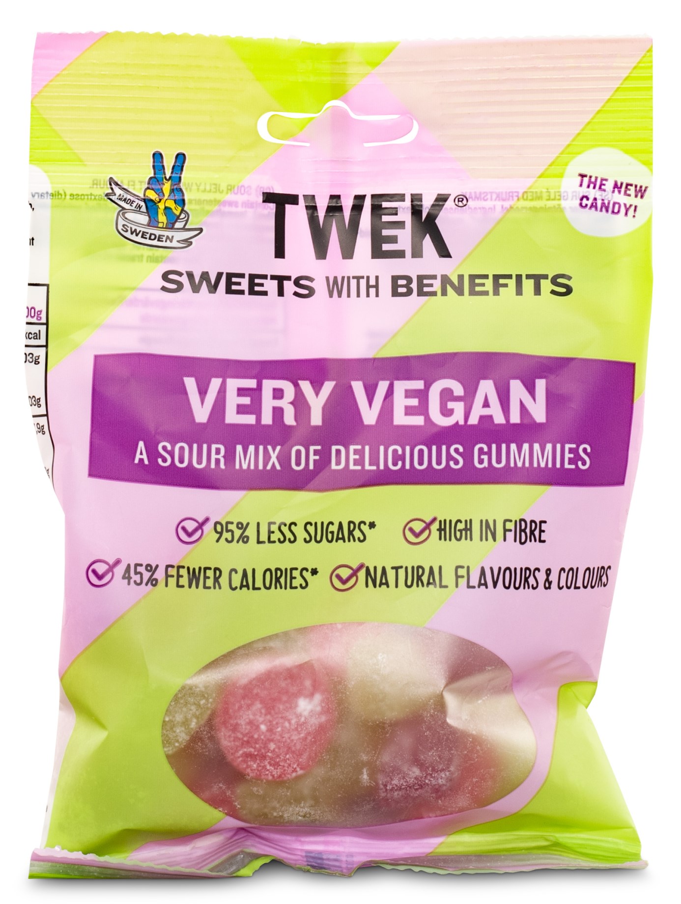 Tweek Gummies Vegan er vegansk slik med et syrligt lag sukker og god frugtsmag. Slikket indeholder naturlige farver og aromaer med 95% mindre sukker, men stadig med en god smag. Tweek er perfekt, når du vil forkæle dig selv med noget godt, men ønsker mindre sukker og færre kalorier.