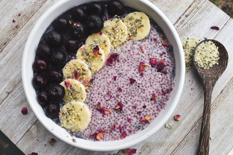 Bland mælk, chiafrø, vaniljepulver og sødning (dadler, sukker, stevia, eller hvad du ønsker) . Lad stå i mindst 20 minutter (gerne natten over). Rør i ny og næ. Når chiabuddingen er puffet op, skal du blot blande sojayoghurt med enten hybenpulver eller acaipulver sammen med chia-blandingen. Bland det hele, og skær bananen i skiver, og top chiagrøden med dem, og andet topping efter ønske! Prøv eventuelt revet kokos, dadler og mandler som topping.