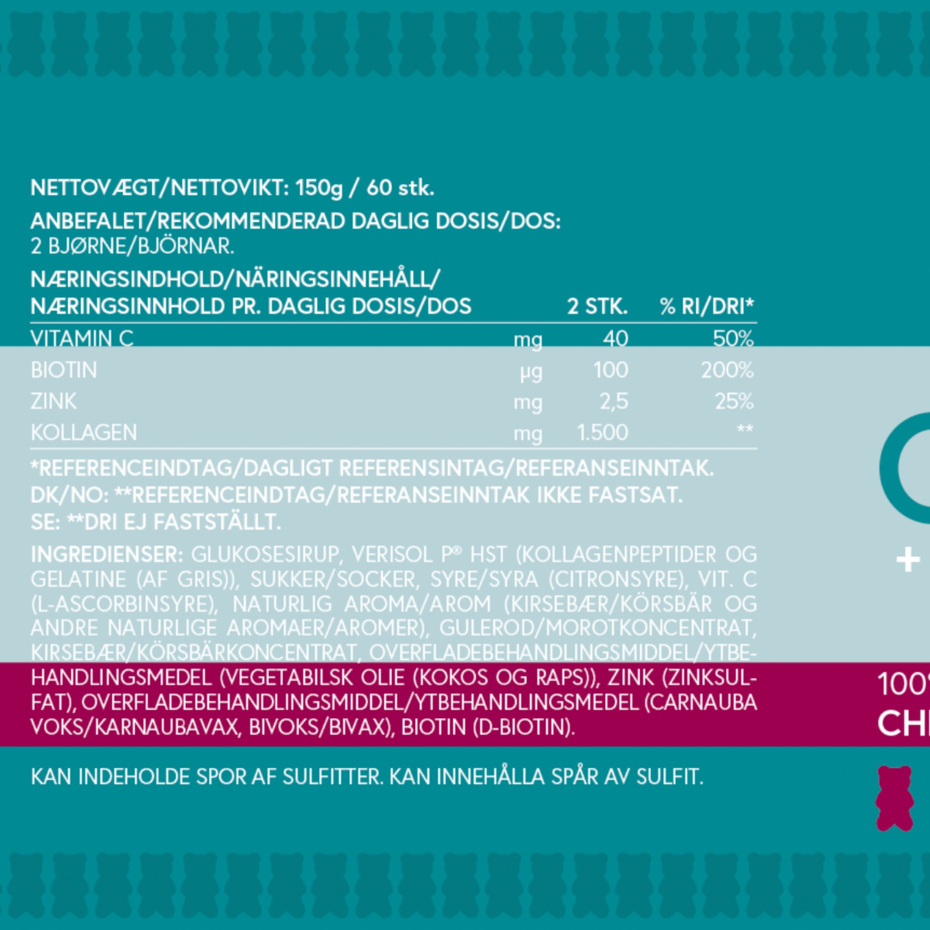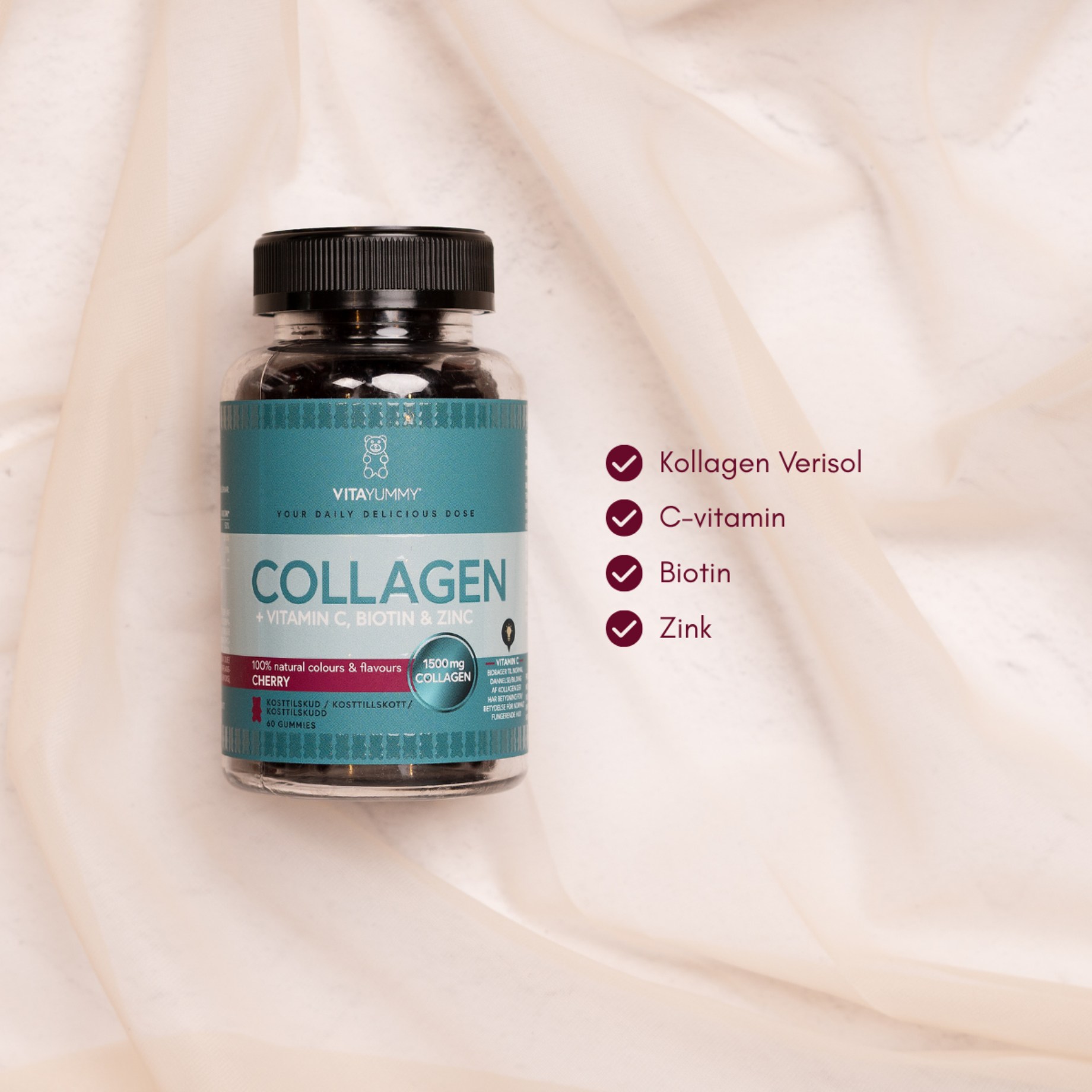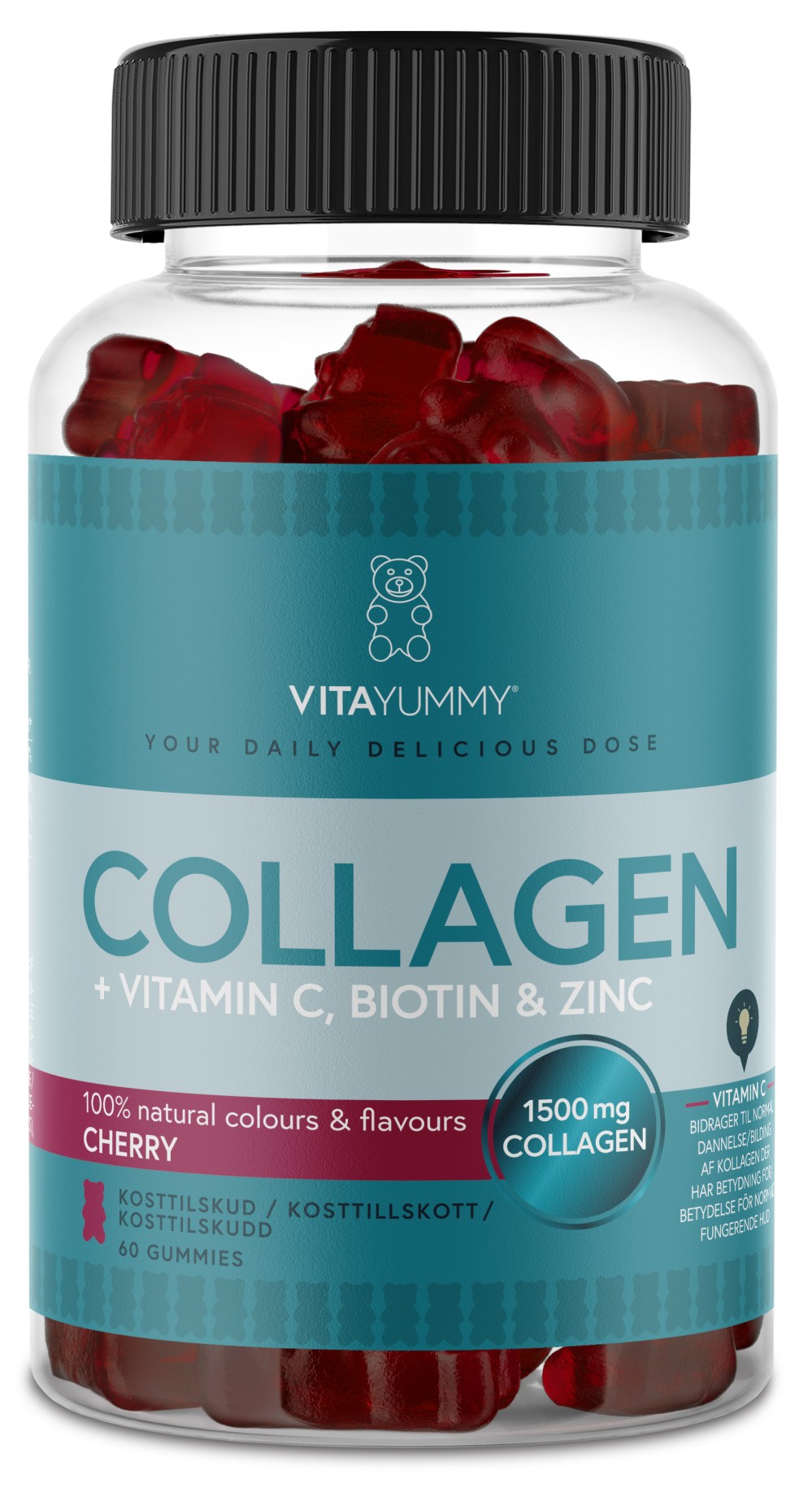 VitaYummy Collagen er kollagen vingummier, der gør det nemt at få kollagen hver dag – de smager så godt, at du ikke glemmer at tage dem! VitaYummy Collagen indeholder 1500 mg hydrolyseret kollagen fra Verisol®, sammen med C-vitamin, som bidrager til en normal dannelse af kollagen, samt biotin og zink, der bidrager til at vedligeholde normal hud.