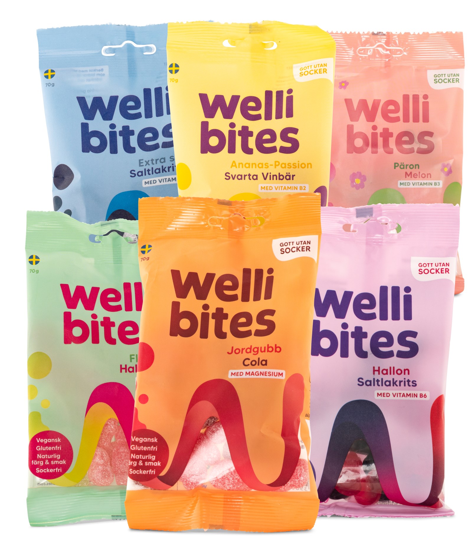 I Wellibites Mixblanding får du seks forskellige typer af Wellibites populære vingummi – perfekt til at prøve og finde din favorit! Wellibites slik er 100 % sukkerfrit, vegansk og indeholder 40 % færre kalorier end de fleste andre slikvarianter på markedet. Derudover er det beriget med vitaminer og mineraler, og de herlige smage og farver kommer fra frugt og grøntsager. Nyd et rigtig godt og sundere slik!