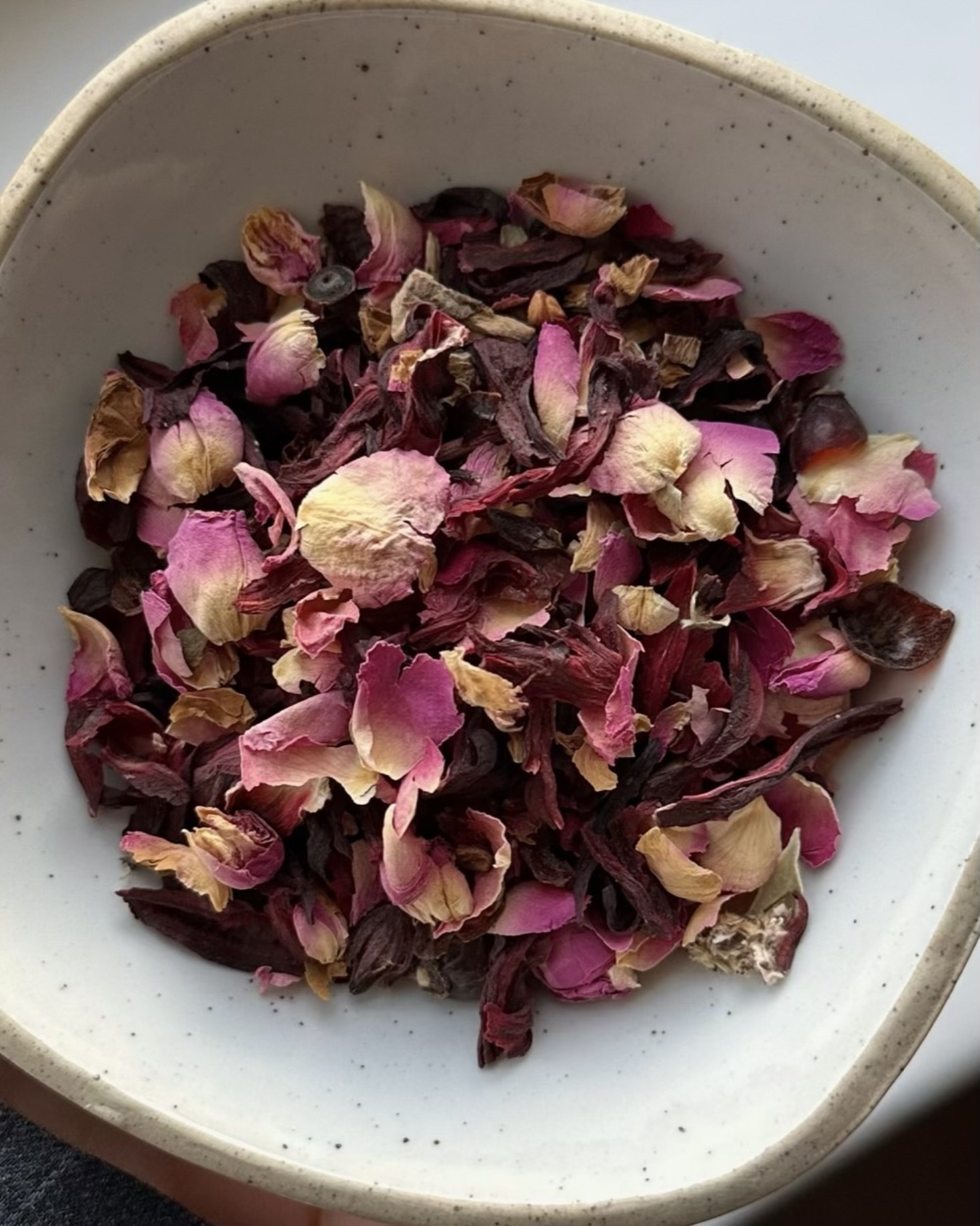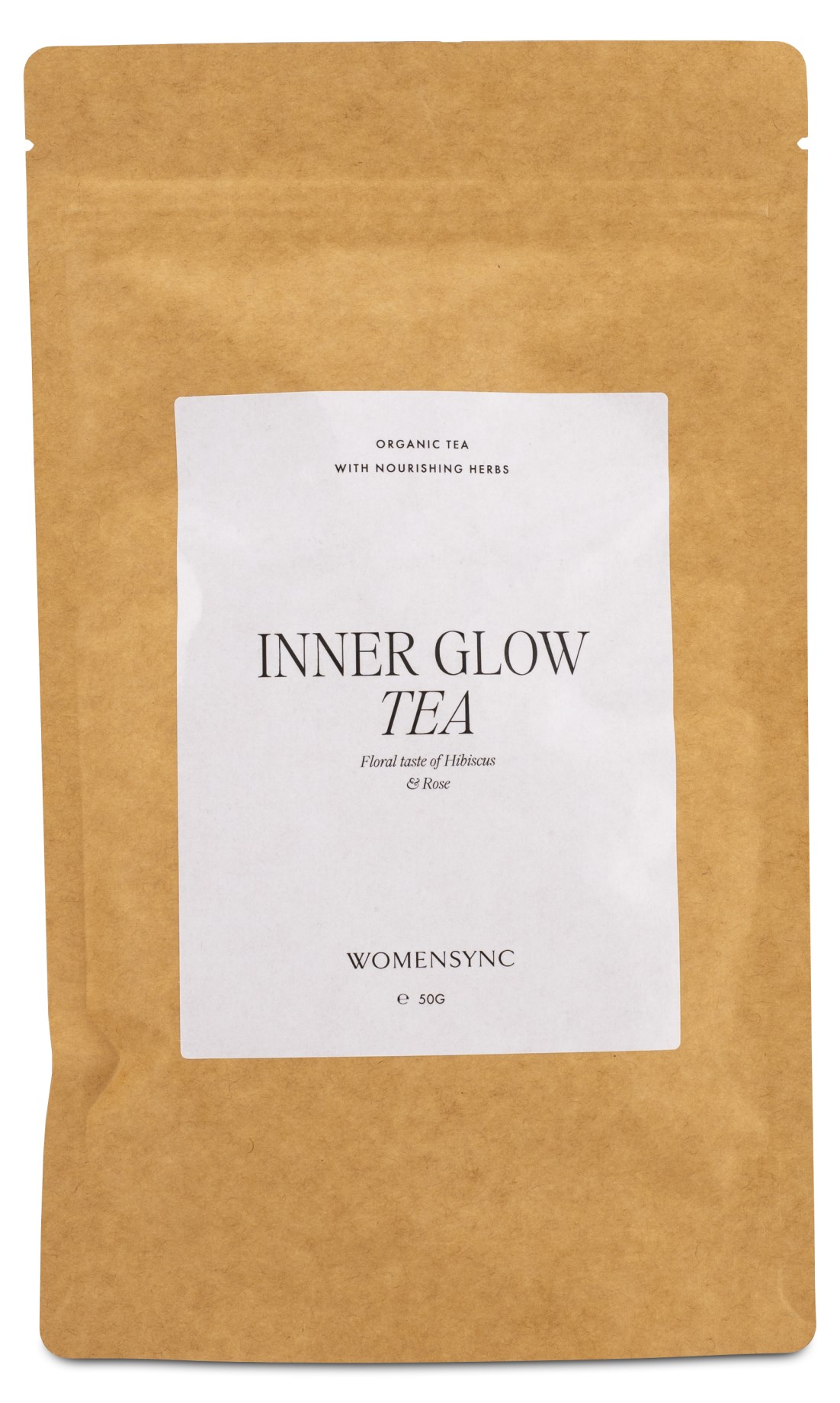 Womensync Inner Glow Tea er en urte-te designet til at booste glød og fugtighed indefra og ud! Teen er økologisk, nærende og naturligt fri for koffein. Kombinationen af urter er specielt sammensat af en certificeret urtespecialist og indeholder hibiscusblomst, hybenfrugt, rosenblade og burrerod. Giver en blomstrende smag med en fremtrædende tone af rose og hibiscus. Drik og nyd!