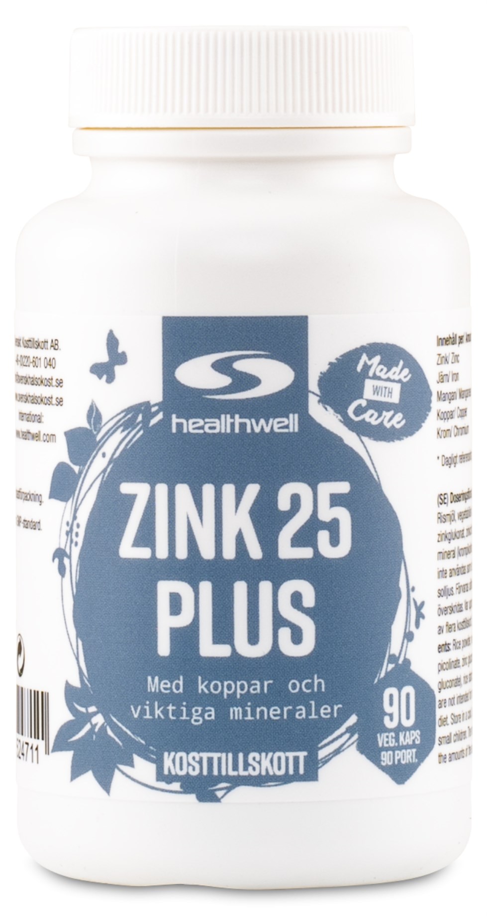 Zink 25 Plus er vegetabilske kapsler med organisk zink fra tre højværdikilder. Dette zinktilskud er ekstra højdoseret, og der er også tilsat andre vigtige mineraler for at undgå, at kroppens niveauer udvaskes. Zink har mange funktioner i kroppen, og det er også en vigtig antioxidant. Dette livsnødvendige mineral påvirker blandt andet omsætningen af protein, fedt og kulhydrater. Zink er også nødvendigt for, at immunsystemet fungerer normalt.